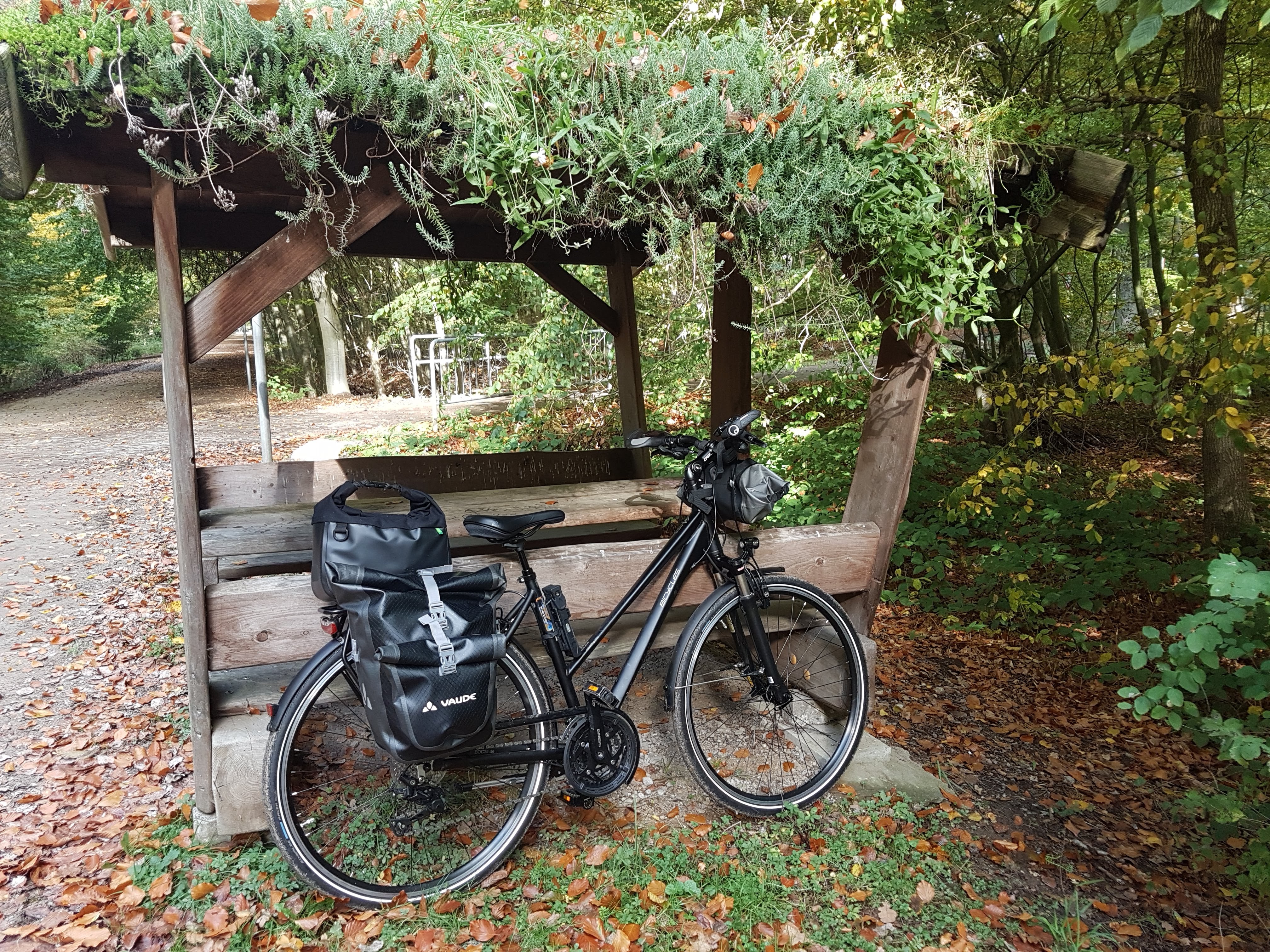 Die Strecke auf der Hinfahrt kann genauso bleiben, wie ich sie geplant habe, sie ist gut so. Es sind etwa 32km, und ich kann mir bei dieser sehr überschaubaren Angelegenheit Zeit lassen – was ich auch mit diversen Pausen tue. Gestartet bei dunkelgrauem Himmel bessert sich das Wetter immer weiter, und zeigt wirklich einen milden, goldenen Oktobertag. Froh bin ich auch darüber, dass die Gleitsicht-Kontaktlinsem, die selbsttönende Brille, die Packtaschen und der kleine Fahrradnavi alle brav ihren Dienst tun – und das Fahrrad natürlich auch. Ach ja: Der Hintern tut hinterher nicht weh – der Sattel funktioniert also auch. Die Tour selbst ist verkehrsarm und sehr hübsch und bietet außerdem viele überdachte Pausenplätze mit bewachsenem Dach – sehr gemütlich und bei Regen natürlich besonders willkommen.