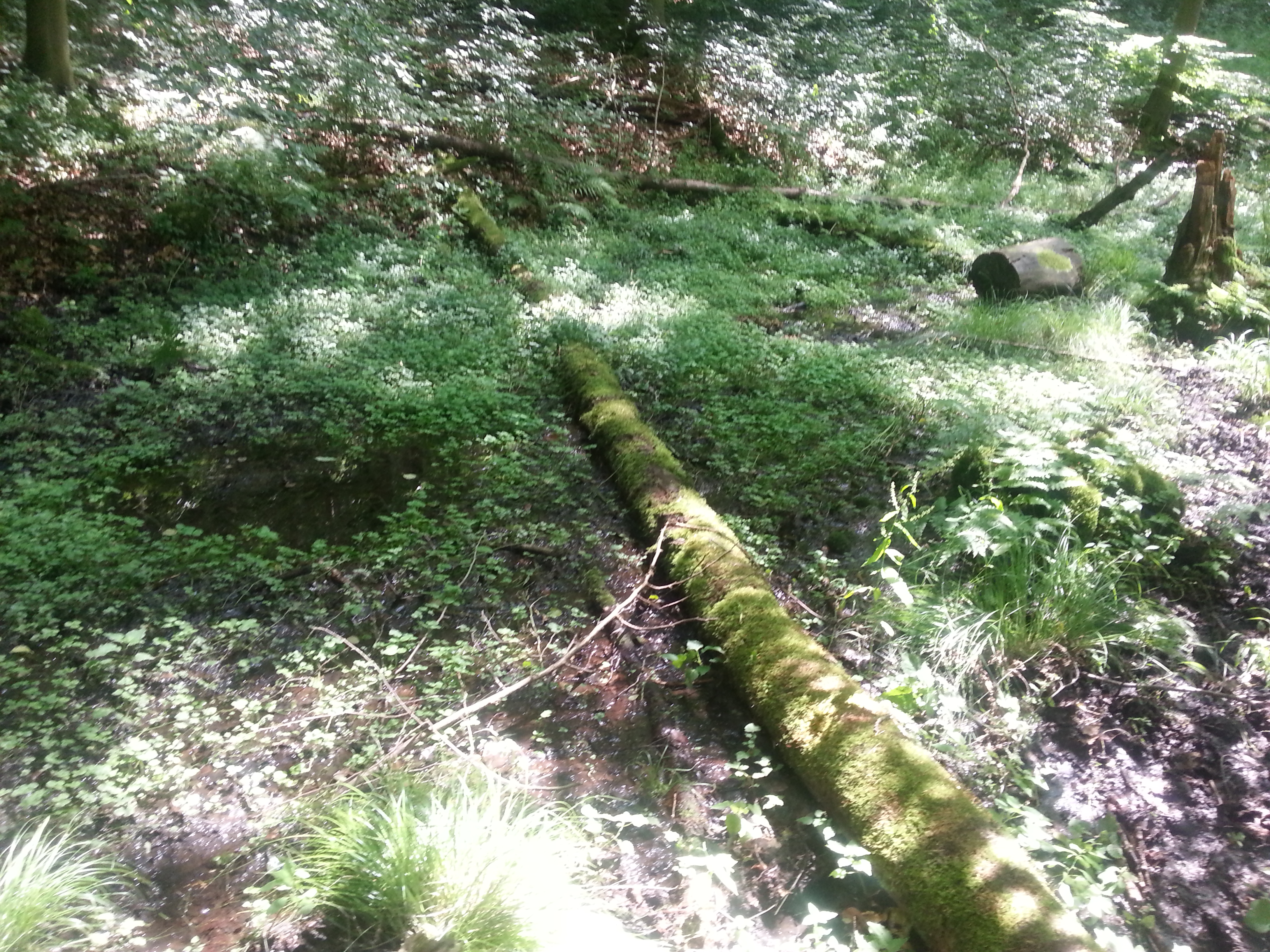 In der Etappenbeschreibung des Weges für den Anfang der 4. Etappe heißt es „Wenn die romantische Fachwerkstadt Naumburg hinter einem liegt, führt der Habichtswaldsteig durch ein verwunschenes Wiesental in einen tiefen Wald.“ (http://www.habichtswaldsteig.de/de/startseite/) . Hier hat die Marketingabteilung nicht übertrieben, es geht wirklich ca. 7 km durch hübschen Wald, etwa 3 km begleitet vom Ballenbach. Dabei ist es zwar schön schattig, aber nicht düster, denn der Bach fließt tatsächlich in einer langen, schmalen Lichtung. An einer Stelle finden sich Forellenteiche, dort kann ich an ihrem Zufluss bestens eine Flasche auffüllen und mich abkühlen. Wenn es nicht verboten wäre, könnte hier auf der anderen Wegseite auch ein wunderbarer Platz zum Übernachten im Wald sein: alle Orte sind weit genug entfernt, es gibt einen guten Zugang und eine große, recht ebene Wiese, plus Frischwasserversorgung…