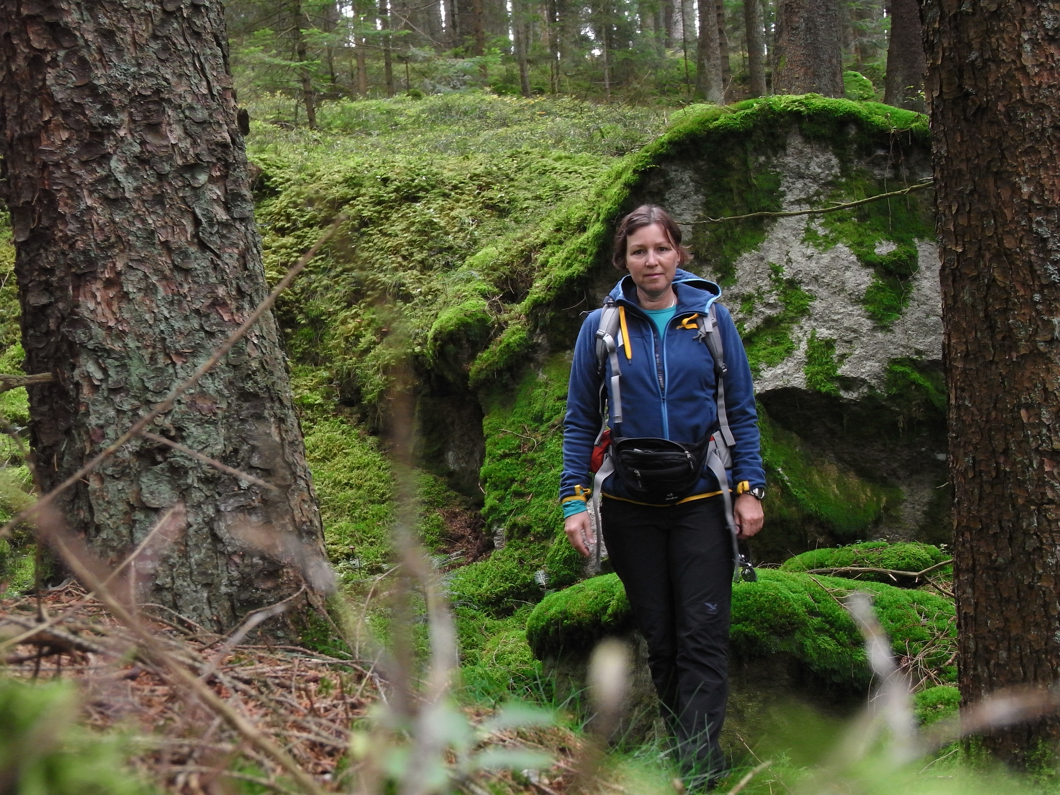 Am Freitag, 03.10.14 musste ich allein los, wie immer in solchen Urlauben mindestens ein Mal. Meine kleine Privattour führte zurück zu unserem Ferienhäuschen, damit ich wenigstens nur zum Startpunkt in Bischofsreut gebracht, aber nicht auch noch abgeholt werden musste. Auf dem Hollerberg in der Nähe von Weißenstein ist alles mit Moos überzogen, und alle kantigen Konturen sind weich, wie im grünen Schnee.