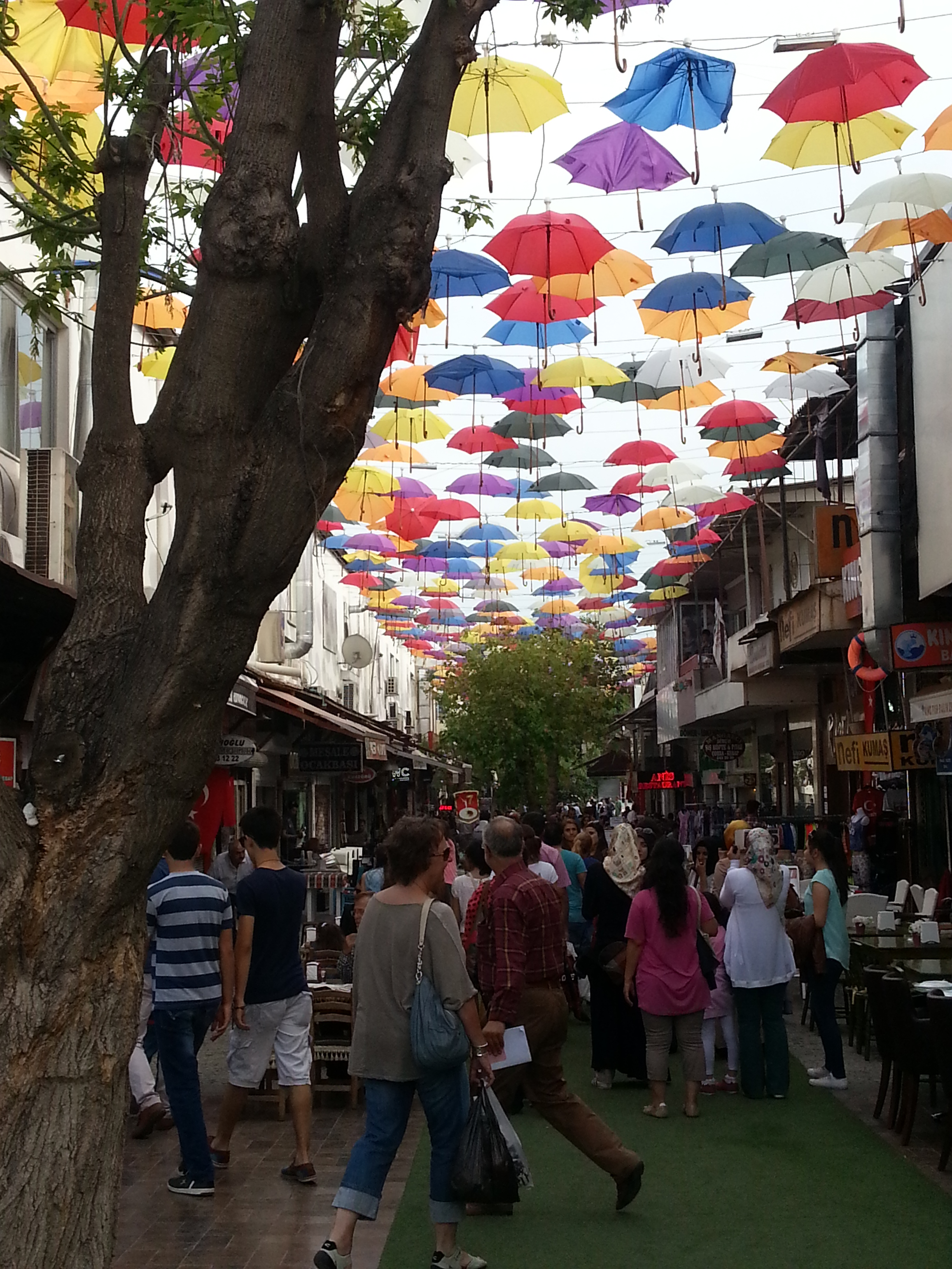 Als ich aus dem Museum herauskomme, sehe ich direkt auf der gegenüber liegenden Straßenseite die Haltestelle für die Straßenbahn – nicht für die neue Antray, sondern für die alte, die als Geschenk der Partnerstadt Nürnberg bei Touristen und Einwohnern gleichermaßen beliebt ist und gern benutzt wird. Tatsächlich ist es eine schöne, gemächliche Bummelfahrt auf der Straße entlang der Altstadt. Direkt im Zentrum steige ich aus, um noch etwas Geld zu besorgen und nach Souvenirs zu suchen – ganz die Touristin. In der Stadt herrscht besonderes Gewimmel, und es war schon auf dem Fußweg durch den „Luna-“Park zum Museum klar, dass gerade ein Feiertag begangen wird: Der 23. April ist der Feiertag der Nationalen Souveränität und des Kindes und wurde eingeführt, um der Eröffnung der Nationalversammlung sowie der Konstitution des ersten freien Parlaments des Landes am 23. April 1920 unter dem Staatsgründer M . K. Atatürk zu gedenken. Er widmete jenen Tag unter dem Motto „Unsere Kinder sind unsere Zukunft“ (Çocuklarımız geleceğimizdir) den Kindern (siehe auch hier). Überall gibt es Musik unterschiedlichster Art, die Kinder sind kostümiert, die großen Familien sitzen zum Picknicken auf dem Rasen, Luftballons und Drachen steigen in die inzwischen warme, frühsommerliche Luft.