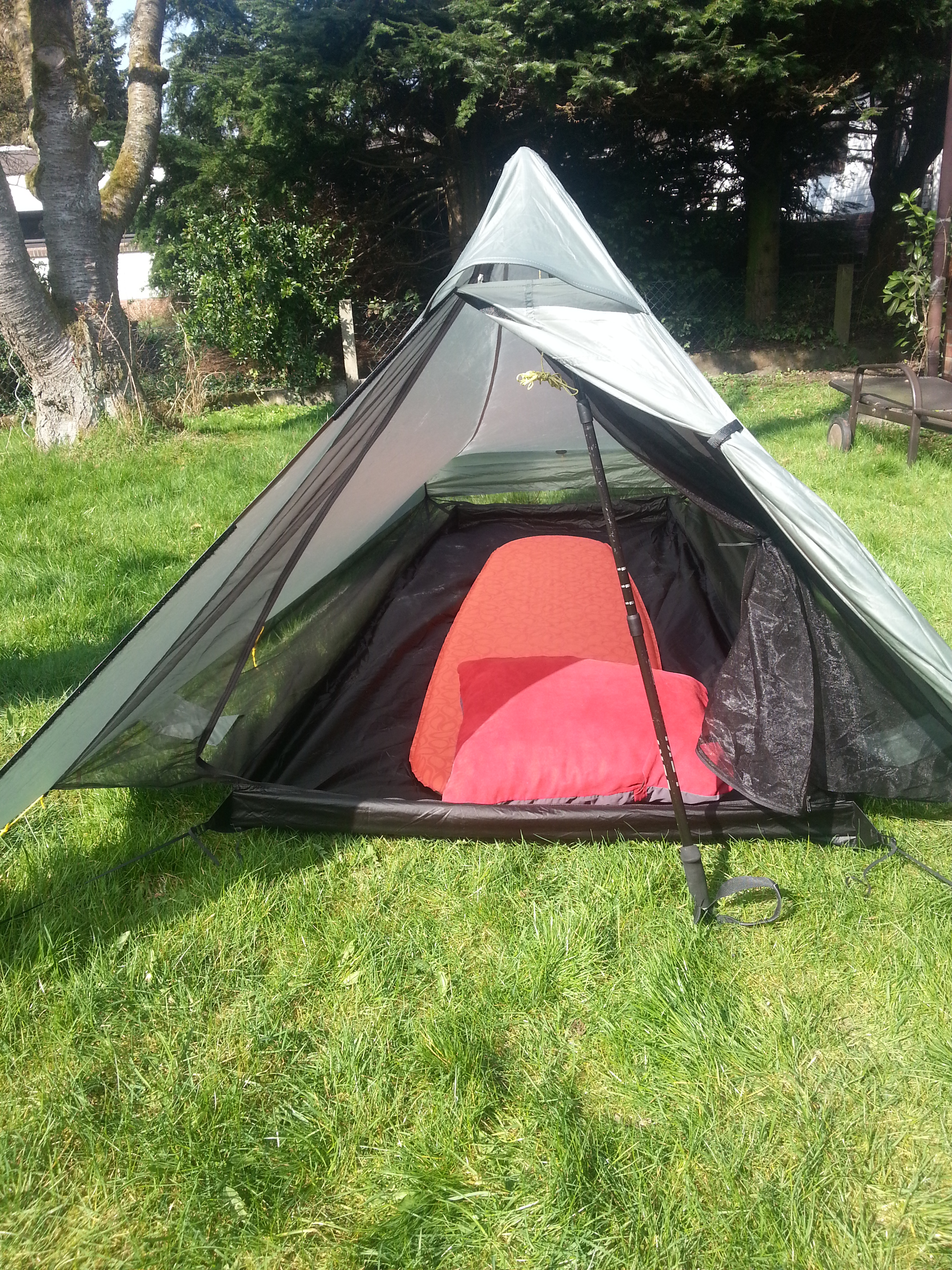 Heute, bei allerschönstem Wetter, habe ich noch einmal das neue Zelt aufgebaut, das ich wegen seiner besonderen Leichtigkeit gekauft habe. Man sieht es ihm nicht an, aber es beansprucht etwa so viel Platz wie ein PKW.