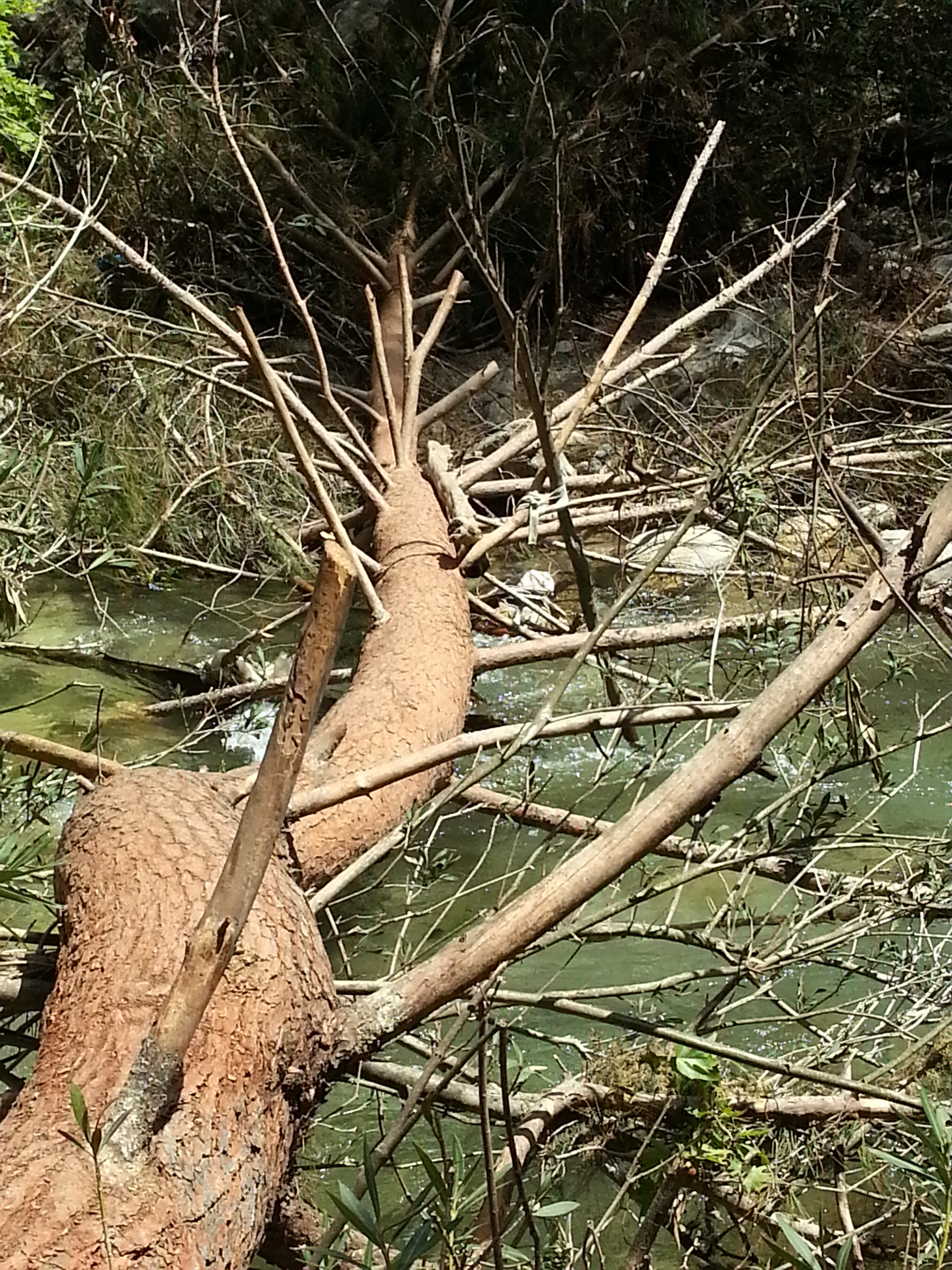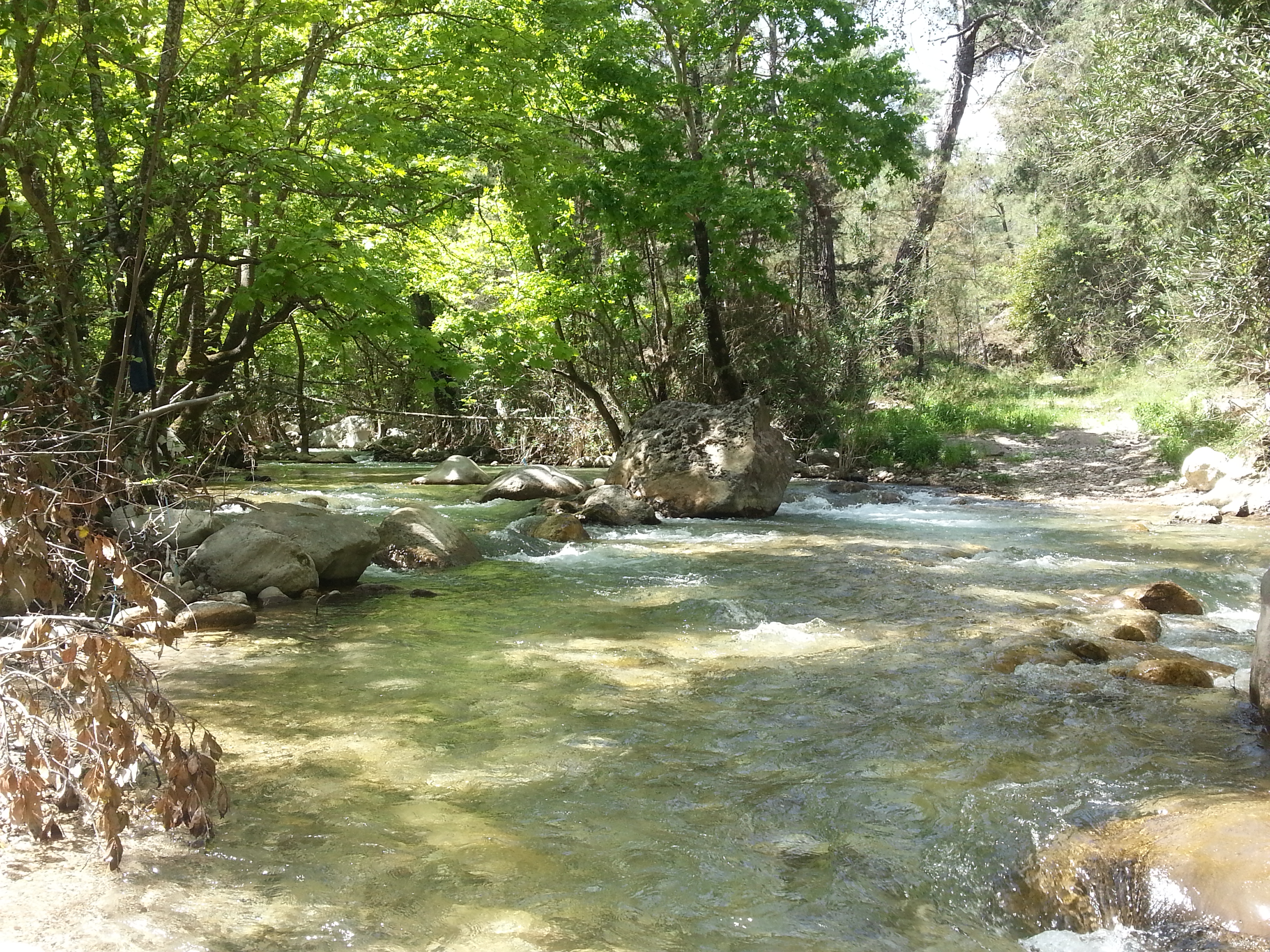 Danach geht es parallel zum Bach auf einem Feldweg durch den Wald weiter, und hier sehe ich ab und an auch mal Mountainbiker. Der Bach hat sich eine kleine, enge Schlucht gegraben, und ich kann auf der Karte sehen, dass ich sie bald queren muss, um auf der anderen Seite zu den Feuern der Chimaera und von dort nach Cıralı zu kommen. Es kommt aber keine Brücke in Sicht – sondern nur ein umgestürzter Baum, über den man klettern soll. Ich sehe sogar zu, als es eine kleine Gruppe tatsächlich auch schafft, allerdings haben alle nur kleine Tagesrucksäcke. An dieser Stelle durch den Bach oder Fluss direkt zu gehen, kommt nicht so richtig in Frage. Die Böschung bis zum Wasser ist steil und voller Gestrüpp, das Wasser rauscht zwischen den mannshohen Felsen mit beträchtlicher Strömung, und die Tiefe kann ich schwer abschätzen.