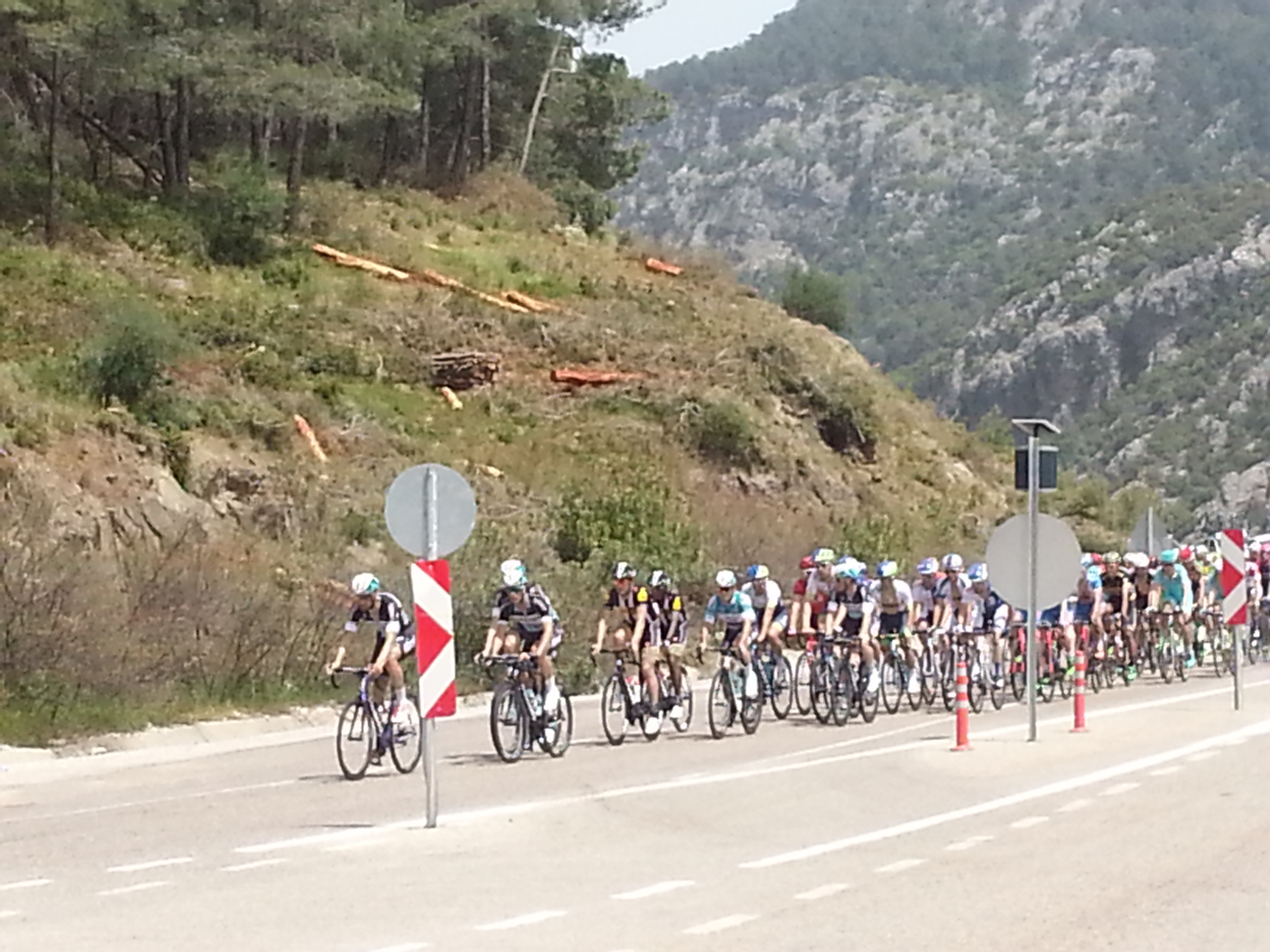 Aus dem letzten Jahr weiß ich, dass von Cıralı aus kein Dolmuş in Richtung Küstenstraße und Phaselis fährt, also geht es erst einmal mit dem Taxi weiter. Oben an der Einmündung in die Küstenstraße angekommen, müssen wir aber vor einer Polizeisperre halten. Zuerst verstehe ich nicht, warum die Küstenstraße gesperrt ist und alle nach uns ankommenden Autos ebenfalls anhalten müssen. Die Leute steigen aus, rätseln herum, bis der Gendarm Auskunft gibt: Ein Radrennen durch die Türkei findet gerade statt, und das Fahrerfeld wird bald an dieser Stelle erwartet. Nach etwa 30 Minuten huscht das Feld vorbei, eskortiert von etlichen Versorgungsfahrzeugen.