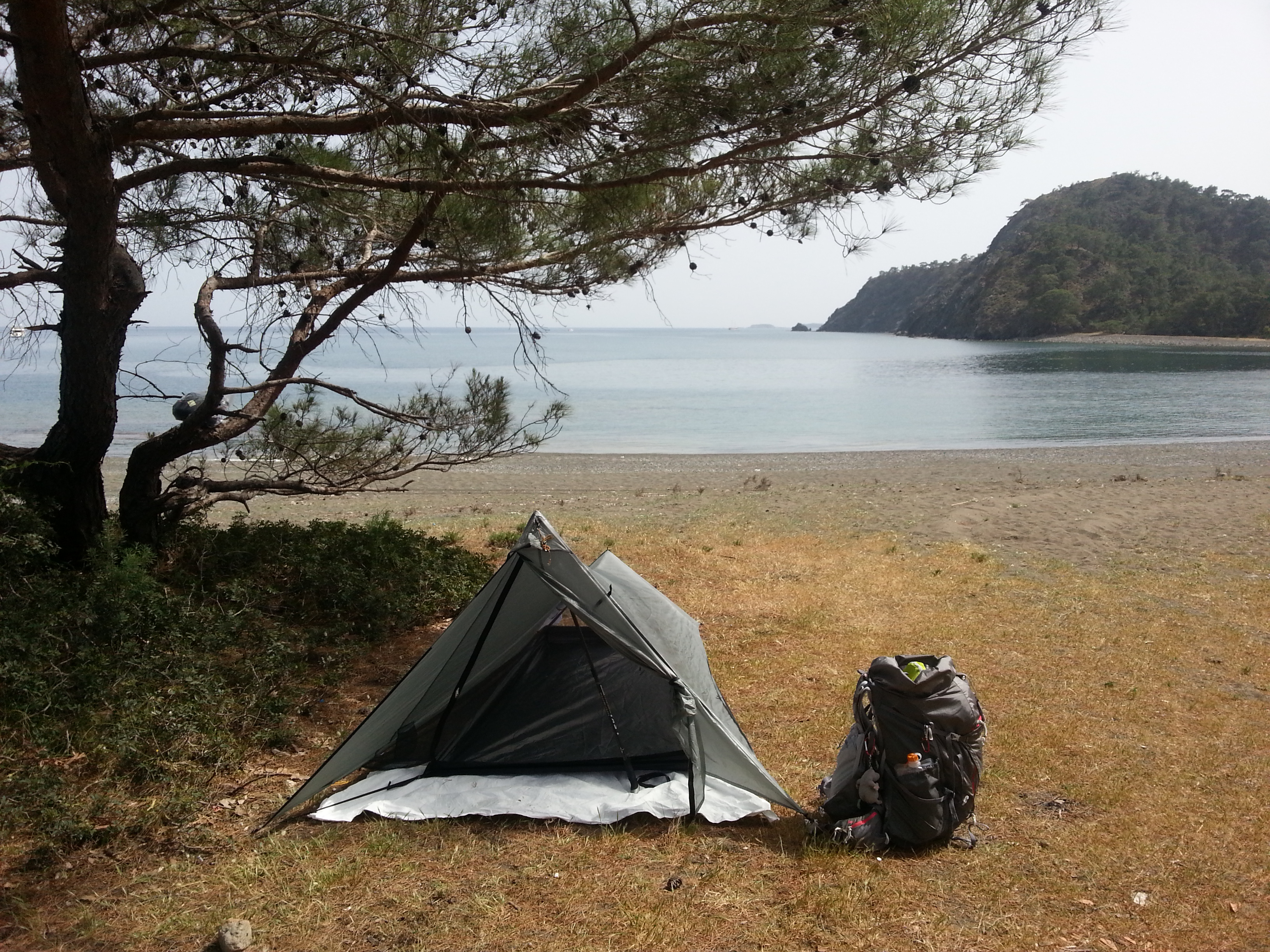 Kurz danach geht es weiter, und der Fahrer setzt mich bald an der Stelle ab, die auch letztes Jahr der Startpunkt für meinem Ausflug nach Phaselis war, als ich mir stockerkältet die antike Stadt angesehen habe. Dieses Mal gehe ich unten am Strand nicht links in Richtung Phaselis, sondern mache mich auf den Weg in Richtung Tekirova, wo ich vielleicht etwas bummeln, einkehren und nach Ersatzschuhen für die Crocs suchen will. Der Lykische Weg führt auch durch das Gelände des Sundance Camp – einer Art besonderer Campingplatz mit Stellplätzen für Zelte und „Baumhäusern“ zum Mieten. Dort irre ich etwas umher, und sofort kommt jemand angelaufen und schickt mich wieder auf den Weg, der auf einer schotterigen Piste durch schattenlose Felder weiter führen soll. Es ist inzwischen recht heiß, und ich suche mir einen Platz unter einem Baum, um zu sehen, ob ich auch anders nach Tekirova komme, und folge dann einem anderen Weg durch den Wald. Hier ist es sehr einsam und kühl, ich befinde mich nicht mehr auf dem lykischen Pfad, und ich bin nicht sicher, ob mich der Alternativweg wirklich problemlos zum Ort bringt, der knapp 3 km weg sein soll. Im Wald wird es sumpfig, und irgendwo muss ein Teich sein, denn ich höre eine Menge Frösche. Ein Stück weiter sehe ich einige Verschläge, die bewohnt zu sein scheinen. Weiter links voraus sehe ich den Ausläufer des 1. Hotels in Tekirova: Eine riesige Spaßrutsche. Ich gehe weiter, aber vor den ärmlichen Hütten sind Wachhunde, die anschlagen, als ich näherkomme. Mittlerweile bin ich unschlüssig geworden, ob ich hier wirklich weiter gehen will – ich muss eigentlich nicht nach Tekirova, ich könnte auch auf anderem Weg wieder zurückgehen, und im Sundance Camp Wasser kaufen und zu Abend essen. Ersatzschuhe brauche ich jetzt auch noch nicht. Während ich unschlüssig herumstehe, kommen mir 2 Wanderer mit großen Rucksäcken entgegen; es sind Mutter und Sohn aus den Niederlanden, sie etwa so alt wie ich, der Sohn in den Zwanzigern. Ich frage, ob ich mich den beiden anschließen darf, und wir gehen zusammen auf anderem Weg zurück in Richtung Sundance Camp und suchen in der folgenden Bucht jeder ein Plätzchen zum Zelten. Eventuell wollen wir uns so gegen 18:00 zum Abendessen treffen. Mein Platz für das Zelt ist ganz so, wie ich es mir erhofft hatte: 20m bis zum Wasser, unter bzw. am Rand von einer Kiefer.