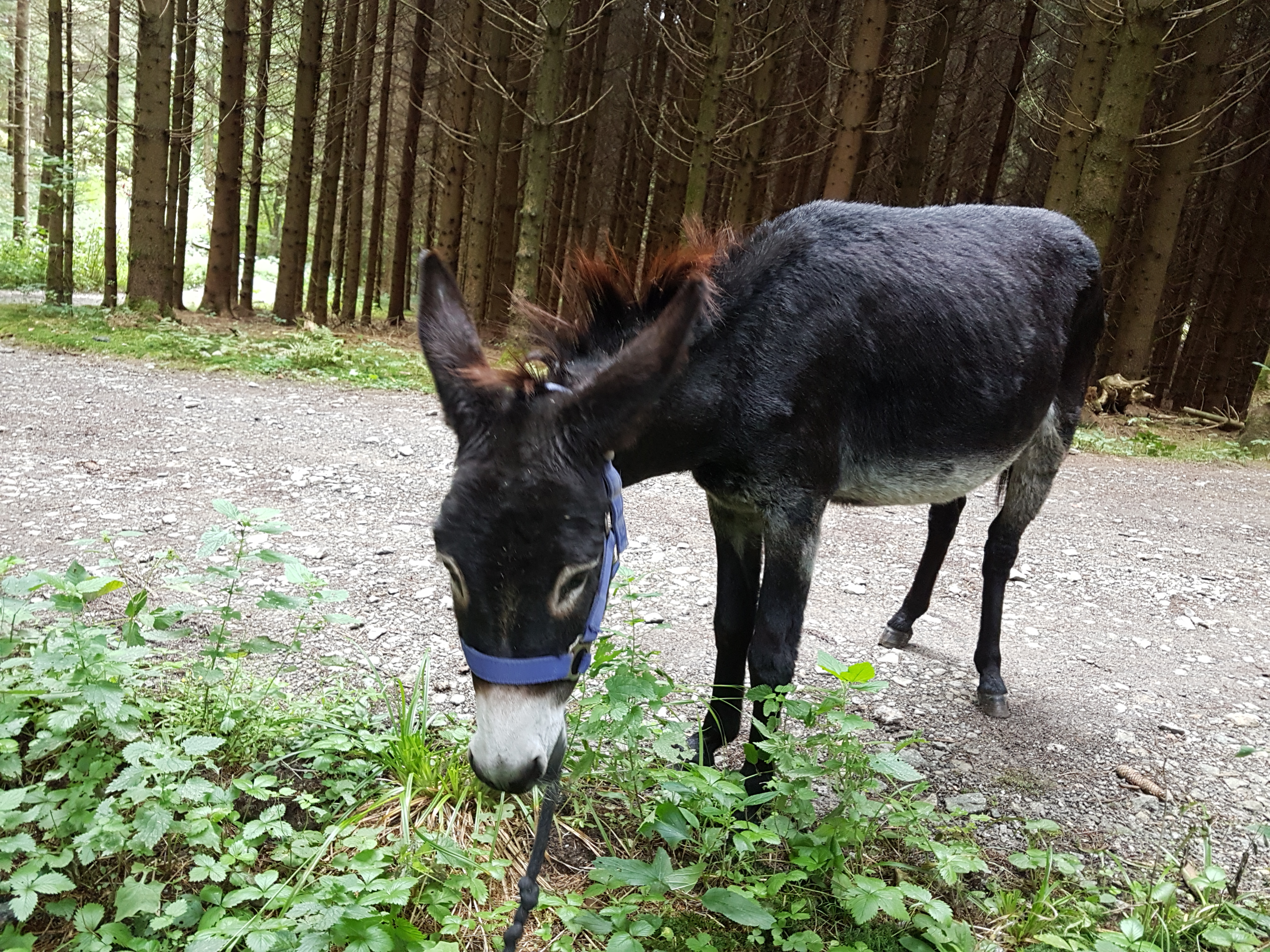 Am nächsten Tag ist das Wetter grau-nass, und es regnet immer wieder ausgiebig. Wir misten den Stall aus, striegeln unsere beiden Begleiter, und los geht’s, dann eben wasserdicht eingepackt. Die Esel haben allerdings keinen Regenmantel…