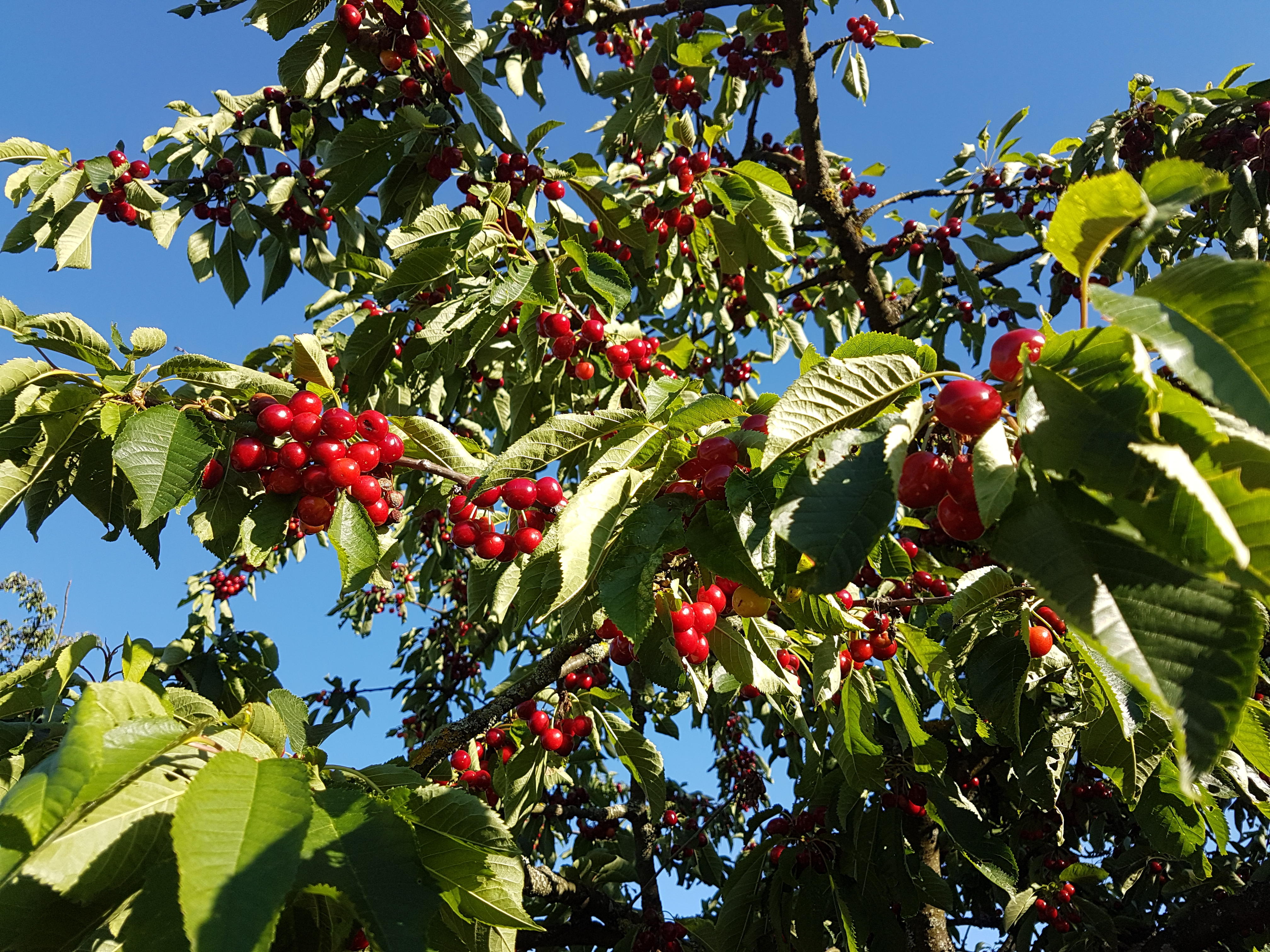 Am Abend gehe ich vom Hotel aus noch zur Bushaltestelle, die ich am nächsten Tag ansteuern will, um die ersten ursprünglich nicht geplanten Kilometer von Gleiszellen-Horbach bis zum Nordende von Klingenmünster mit dem Bus zu überbrücken. Auf dem Weg dorthin kann ich mich mit mit Kirschen zum Dessert eindecken, die direkt am Weg hängen und quasi darum betteln, von mir gepflückt zu werden.