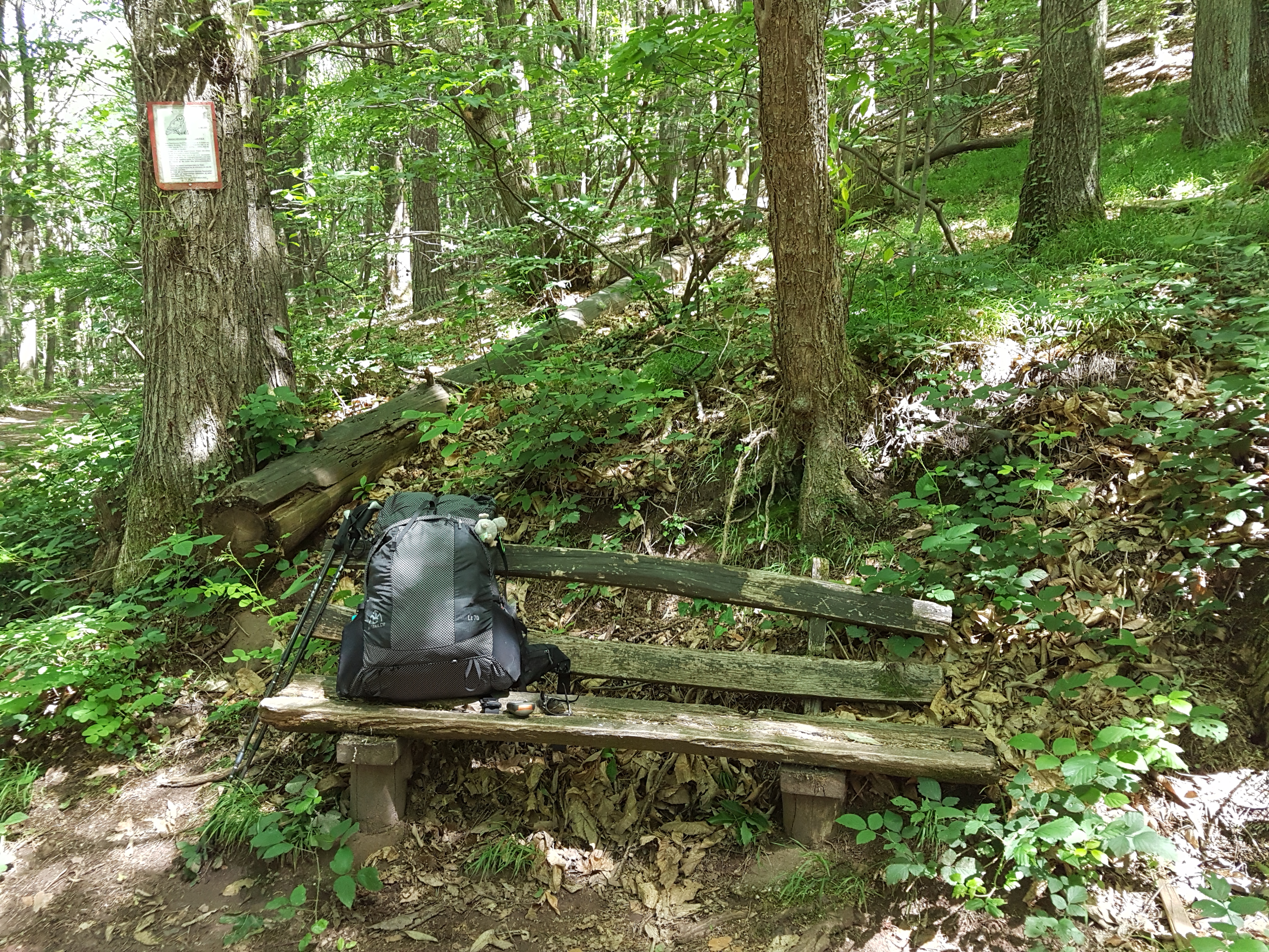 Mit genügend Wasser komme ich auch ohne Café klar. Der Weg ist und bleibt schön; und heute kann ich ihn auch fast beliebig verkürzen oder verlängern. Ich entscheide mich für eine mittlere Variante. Kurz vor Ramberg – ich mache gerade Pause auf einer Bank – kommt mir ein anderer Wanderer entgegen. Das große Gepäck outet ihn natürlich sofort ebenfalls als Trekkingplatzbenutzer, und wir kommen in’s Gespräch. Der Platz Modenbacher Hof hat ihn nicht so sehr begeistert, es wäre für mich vielleicht eine interessante Information für ein nächstes Mal. Er steuert den Trekkingplatz Nr. 5 Eußerthal an, wo ich gerade herkomme.Ich berichte ihm daher von dem Brunnen direkt im Ort, der praktisch keinen Umweg bedeutet.