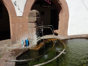 Etwas später macht mich eine einheimische Dame auf einen Brunnen aufmerksam, der mitten im Ort ist und Trinkwasser führen soll (Gegenüber der Einmündung von der „Hauptstraße“ in die „Haingeraidestraße“). Ich glaube ihr natürlich und fülle alles wieder auf; sie hat Recht, das Wasser ist gut und man muss sich nicht wie in der Beschreibung zum Trekkingplatz angegeben erst ein ganzes Stück außerhalb des Ortes an der Landstraße an einer anderen Quelle versorgen.