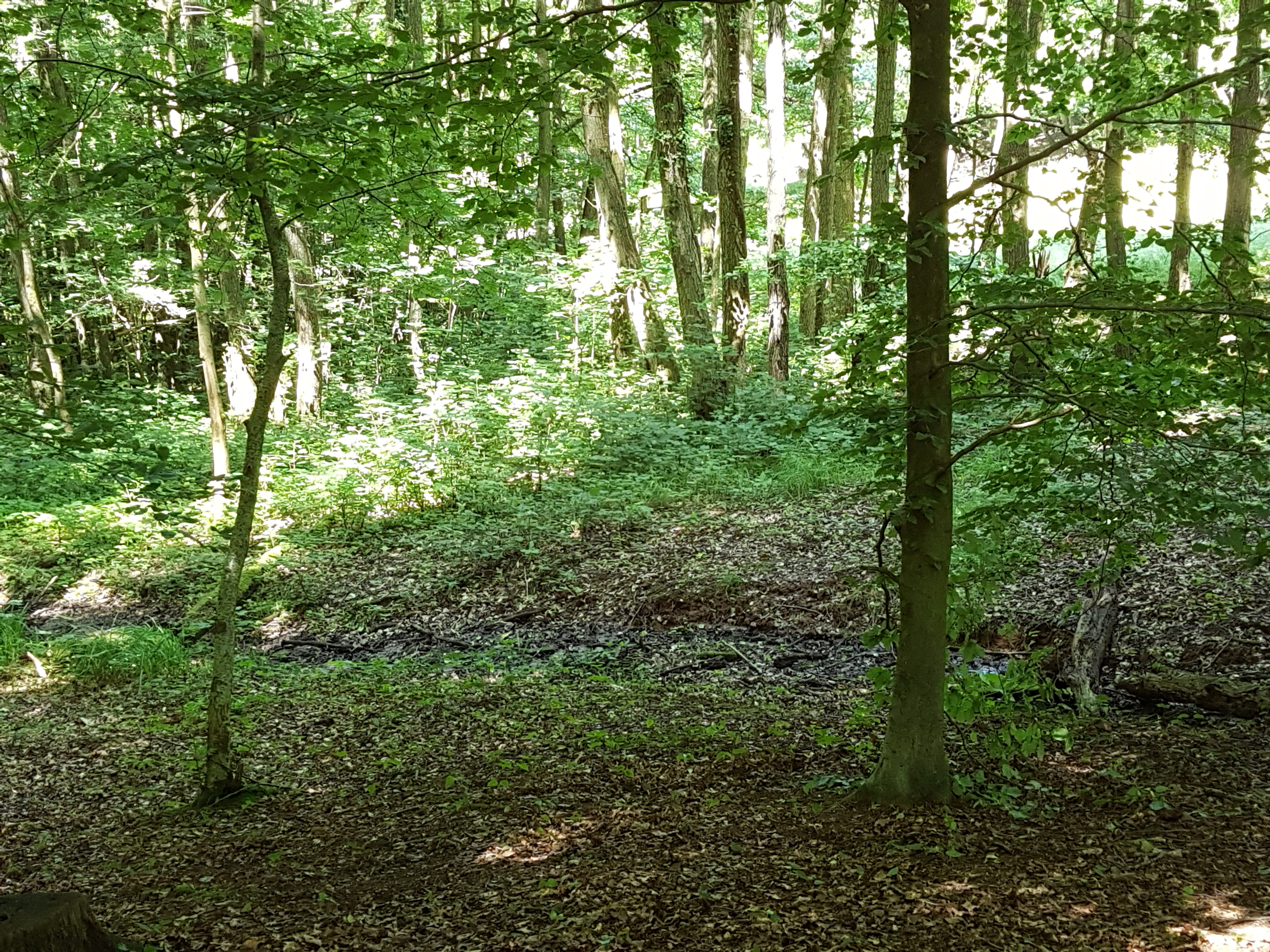 Am nächsten Tag – nun Dienstag, 13.06.17 – gehe ich durch Annweiler, das ein sehr hübscher Erholungsort ohne zu große Bausünden ist. Um den vorgesehenen steilen Anstieg zum Turnerheim zu umgehen, will ich seitlich am Hang bleiben und auf anderem Weg die Bundesstraße überqueren, um später wieder auf den vorgesehenen Track zu stoßen. Dieses Mal klappt mein Plan überhaupt nicht, ich komme nicht über die Böschung an der Bundesstraße, zusätzlich kann ich auch den Wildschutzzaun nicht überwinden und muss daher zurück. Es geht im Übrigen durch abwechslungsreichen Wald und bleibt auch so, bis ich Gräfenhausen erreiche. Unterwegs kann ich mich auch sehr schön mit Wasser versorgen.