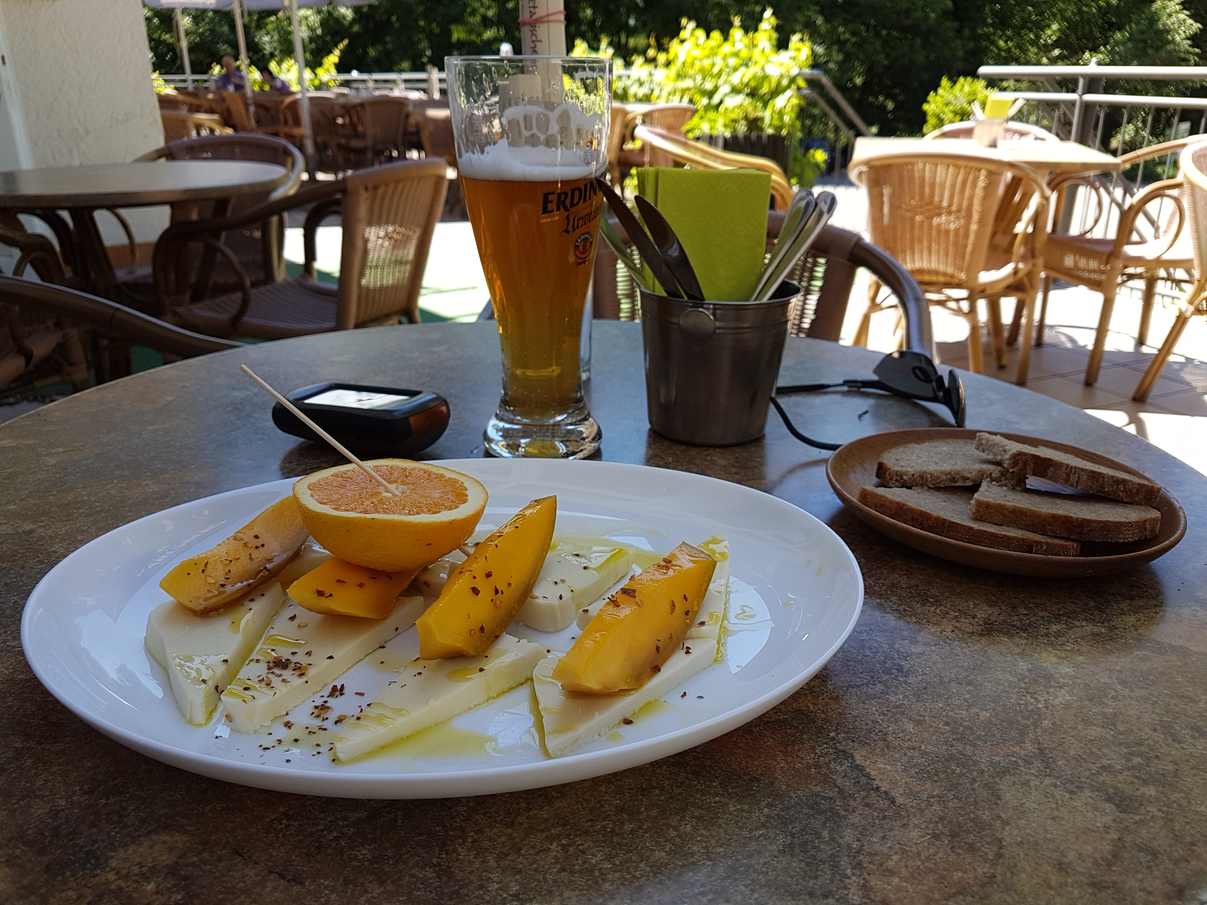 Ich hole mir an diesem Abend leckeren Flammkuchen, packe später alles schon ziemlich weit wieder ein und kann zurückblicken auf 6 wundervolle Wandertage voller Wärme und Sonne, Anstrengung und Erholung – und voller Genuss.