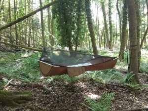 Es folgt der Aufbau meines Dendronaut-Rundum-Sorglos-Pakets (Hängematte Koma plus Tarp als gesonderte Anfertigung, mit modifizierten Sleeves aus Mesh – ich habe an beiden Teilen ein Stück eigenen Moskitonetzstoff (leider in einer anderen Farbe) zur Verlängerung angenäht, damit sie für das lange Tarp reichen). Das Tarp brauche ich zum Glück nicht, um Regen und/oder Wind abzuhalten, sondern nur als Sichtschutz und vielleicht, um die morgendliche Sonne etwas zu dämpfen.