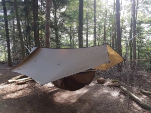 Ich brauche dieses Mal nicht ganz so lange, um mir ein Hängeplätzchen auszusuchen, und baue mein Lager auf. Mit den Erfahrungen vom letzten Mal spanne ich auch das Tarp anders auf und sichere es an zum Teil extra herbei geschleppten Baumstammteilen, so dass mir der Wind nicht wieder in die Quere kommen kann.