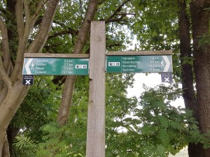 Der Weg ist hübsch und abwechslungsreich, es läuft sich auch mit der dicken Bandage gut – und ich gewinne die Zuversicht, dass ich meine Pläne in veränderter Form gut umsetzen kann. Viele Wanderer sehe ich nicht, nur vereinzelt; und ein Mal in der Nähe von Thonhof kommt ca. 200 vor mir jemand aus einem Seitenweg, der nackt aussieht. Ich kann mir darauf keinen Reim machen, aber der Blick durch das kleine Fernglas bestätigt: ich sehe einen nackten Mann von hinten, der ein Korb oder Eimer trägt. Auf mich wirkt das sehr, sehr seltsam, und ich halte den großen Abstand. Wer weiß, vielleicht ist das ein exhibitionistischer Triebtäter? Ein Kettensägenmörder? Das Rätsel werde ich nie lösen, der Triebtäter geht bald einen anderen Weg als ich und wir tun uns gegenseitig nichts.