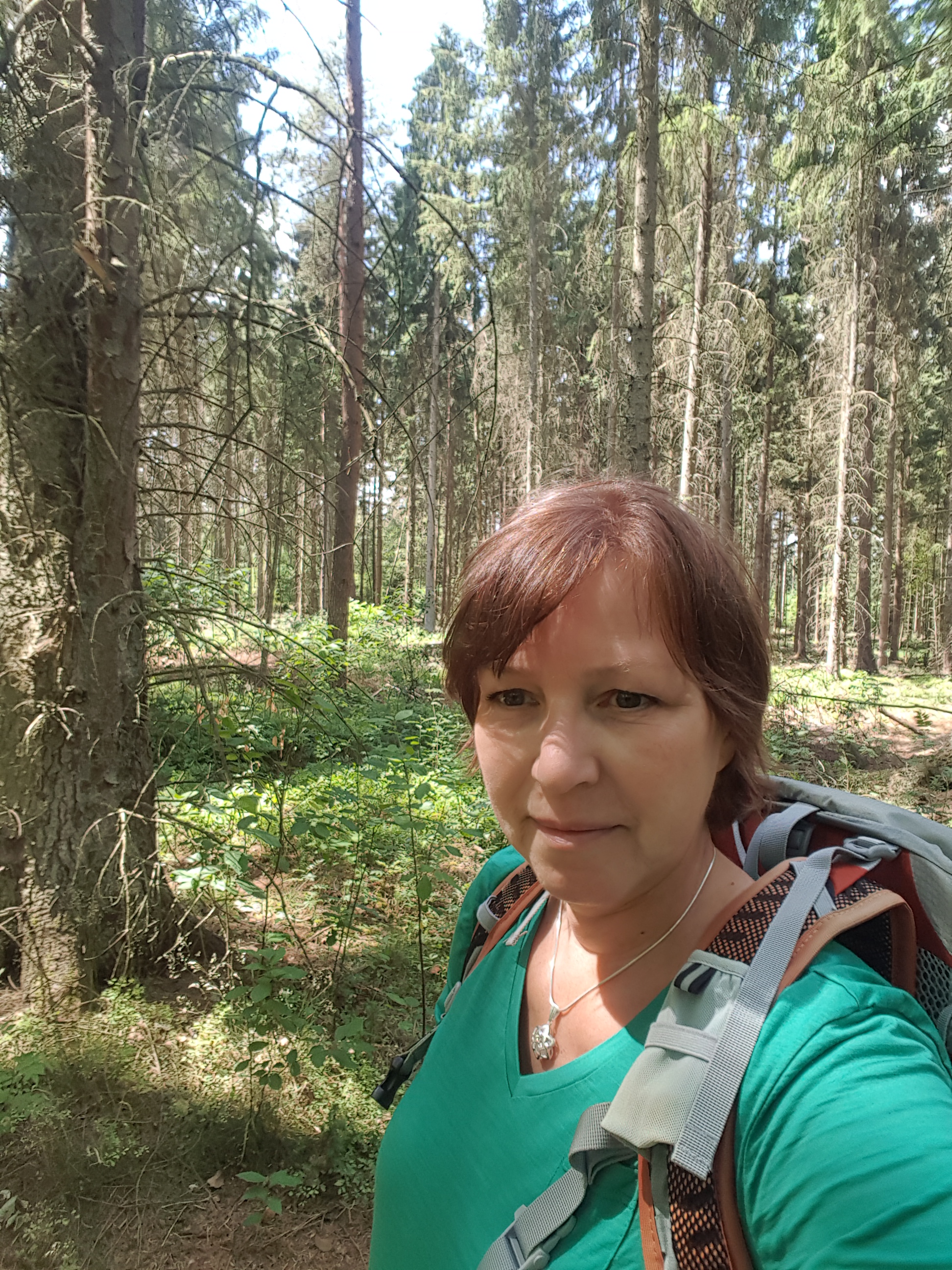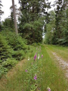 Am 13.06.18 mache ich mich wieder auf den Weg nachhause; dafür habe ich mir selbst einen Weg bis zum Bahnhof Wintermoor zusammen geklickt, und hoffe, dass ich mir nicht nur große Forstwege ausgesucht habe. Dem ist nicht so, teilweise sind es Pfade mit umgestürzten Bäumen und kniehohem Gras ohne Spuren – hier dürften nur selten Menschen vorbei kommen. Es gibt auch hübsche Forstwege