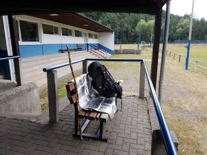 Am Mittwoch, 11.07.18 ist es morgens wechselnd wolkig – auch graue, etwas bedrohlich aussehende Wolken sind dabei – und rattenkalt. Ich ziehe 2 Jacken übereinander, eine davon ordentlich gefüttert, und mache mir bei windigen 14,5°C Kaffee und taue danach allmählich auf.Heute will ich bis Gossersweiler-Stein, wo ich in einem kleinen Hotel ein Zimmer gebucht habe. Wieder vermisse ich beim Packen schmerzlich einen einfachen Tisch und brauche eine ganze Weile, bis ich wieder alles verstaut habe. Dann geht es den länglichen Zuweg zum Platz wieder zurück, und am Rand von Vorderweidenthal mache ich Pause am Sportplatz, denn über mir sieht es sehr dunkelgrau aus.