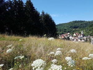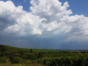 Am Dienstag, 17.07.18 setzt sich die lange Reihe heißer, sonniger Tage fort. Ich beschließe, noch einen Tag hier in Burrweiler anzuhängen und unternehme nur eine kleine Rundtour um den Ort mit leichtem Gepäck. Ich komme auch an der St. Anna Kapelle vorbei, und erfahre, dass heute einer von mehreren Wallfahrtstagen im Jahr ist. Die Veranstaltung ist aber schon vorbei, und so kann ich keinen Blick in die hübsche Kirche werfen. Als ich etwas später aus dem Wald komme, ist es wieder dunkelgrau, die Wolken tümen sich hoch auf.