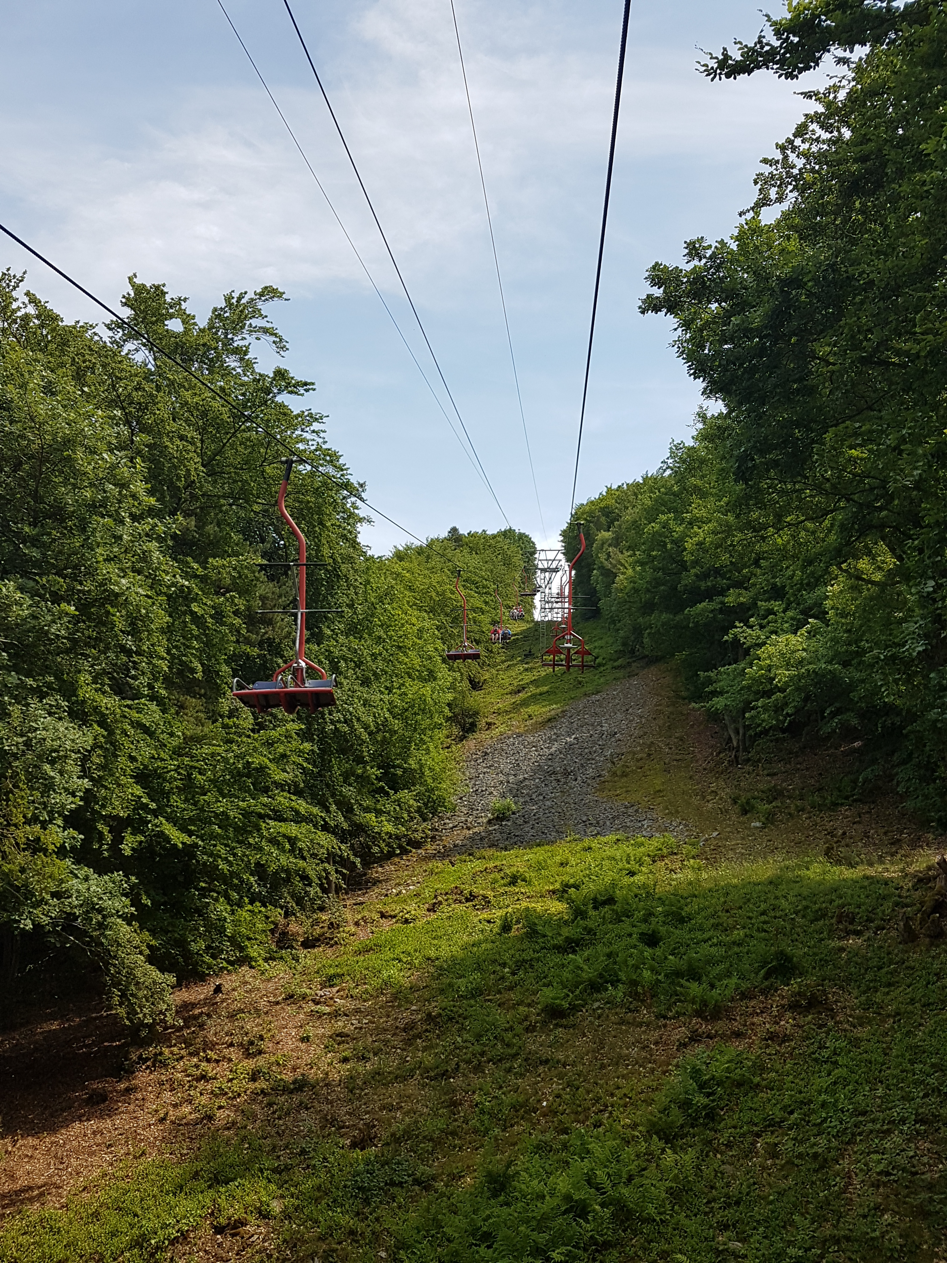 Mein Ringticket nutze ich, um mit dem Sessellift zum Jagdschloss Niederwald hochzufahren, und neben mir beansprucht der Rucksack einen eigenen Sitzplatz.