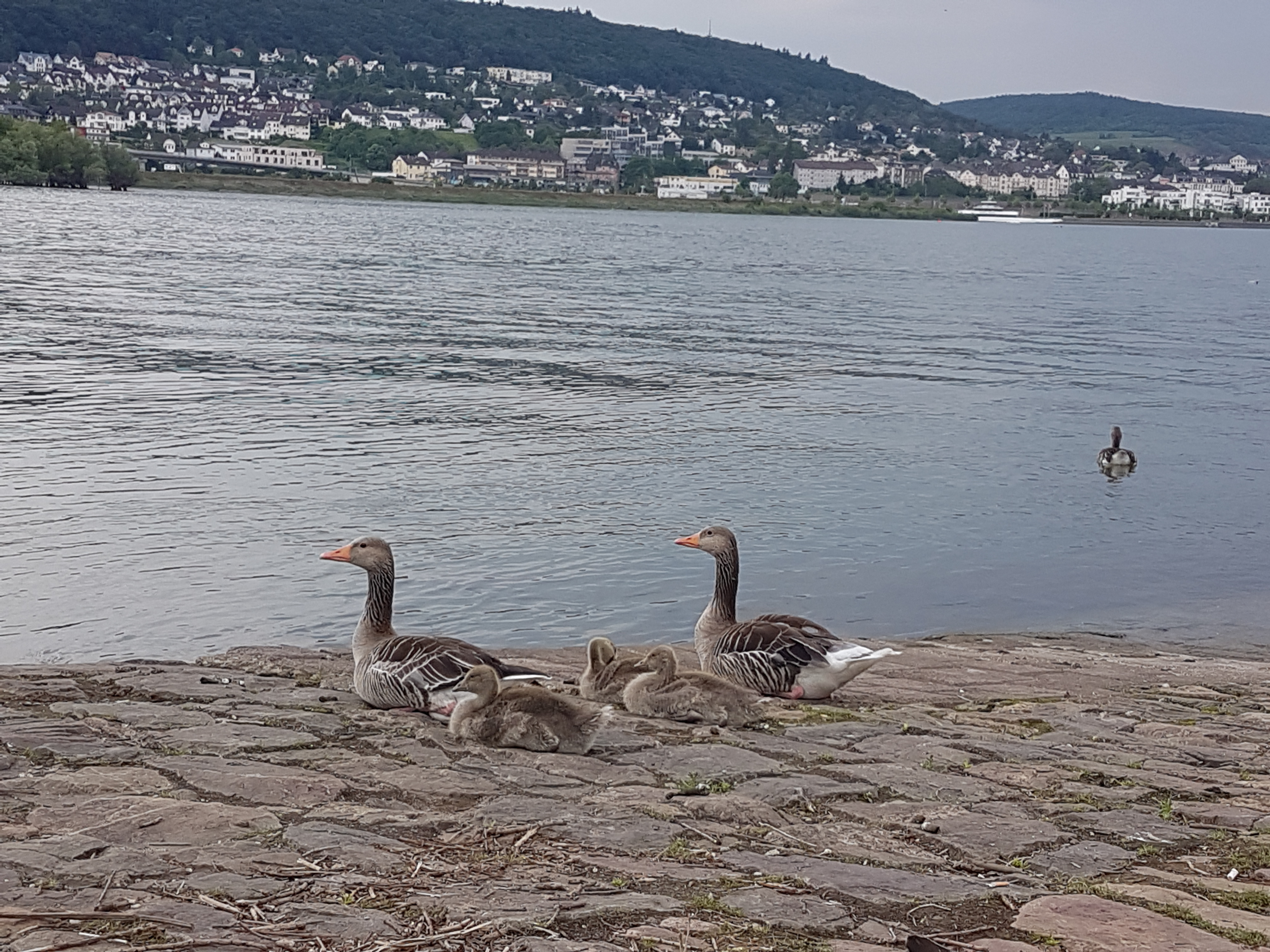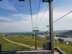 fahre ich bald mit dem Kabinenlift wieder runter, dann nach Rüdesheim. Dabei kann man ganz gut erkennen, dass der Rhein ab hier stromaufwärts Richtung Wiesbaden von sanfteren Hängen umgeben ist, die steileren Hügel im Mittelrheintal laufen hier allmählich aus.