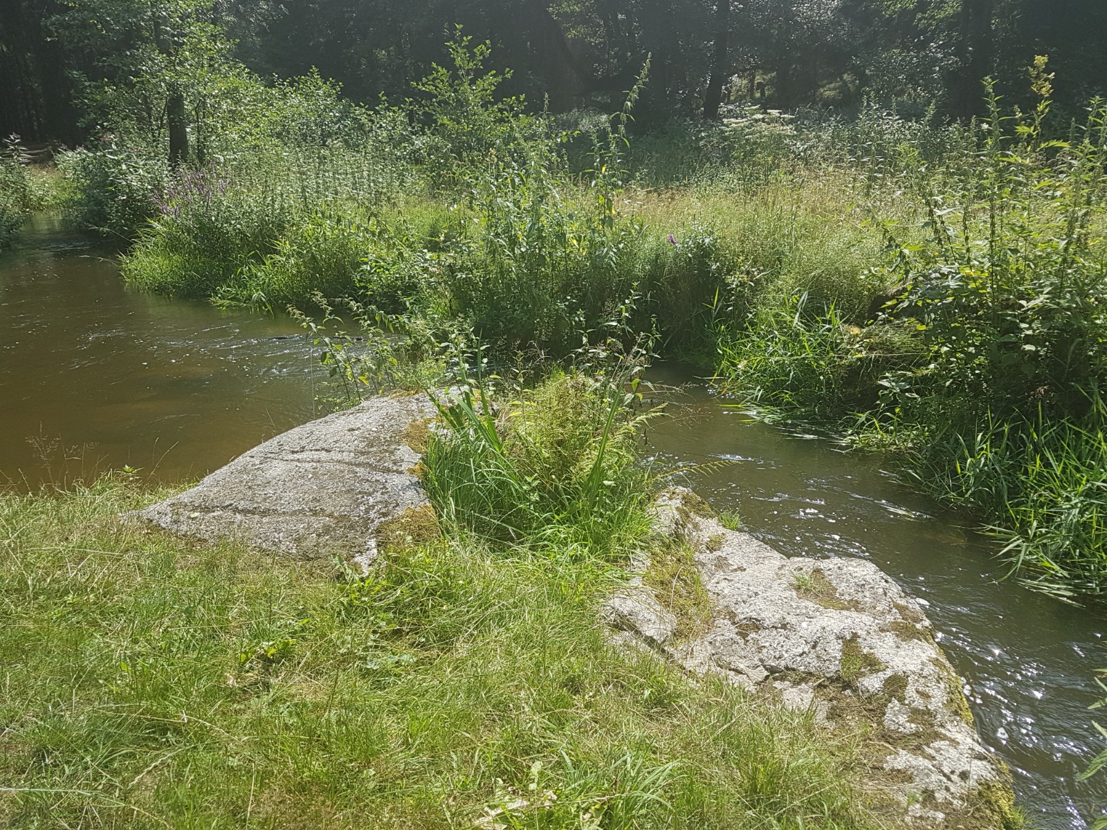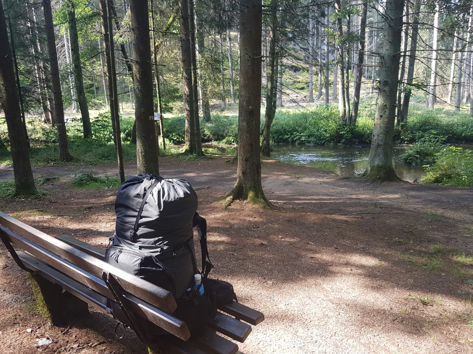 Am 23.07.18 folgt die Etappe durch das Tal der Waldnaab, auf die ich sehr gespannt bin. In der letzten Ausgabe des Magazins „Trekking“ war ein sehr positiver Bericht über diesen Abschnitt des Goldsteigs und benachbarte Wanderwege. Von Falkenberg aus ist es nur ein kurzer Weg, dann erreicht man schon das Flusstal und damit auch eine kleine, besondere Welt. Das Wetter ist heiß und drückend, und über den Schatten im Tal bin ich froh, über die nicht unwahrscheinliche Neigung zu Gewittern eher nicht. Die Waldnaab ist ein kleines Flüsschen, das mitunter sogar ein bisschen wild wirkt. Es gibt viele Passagen mit großen, rund abgeschliffenen Felsen, aber auch solche, die durch lichten Wald und Wiesen führen. Es wird mir nie langweilig, auf das Wasser zu sehen, und der Weg ist nicht schwierig zu gehen, sodass ich nicht ständig auf den Boden für den nächsten Schritt sehen muss. Einfach ideal!