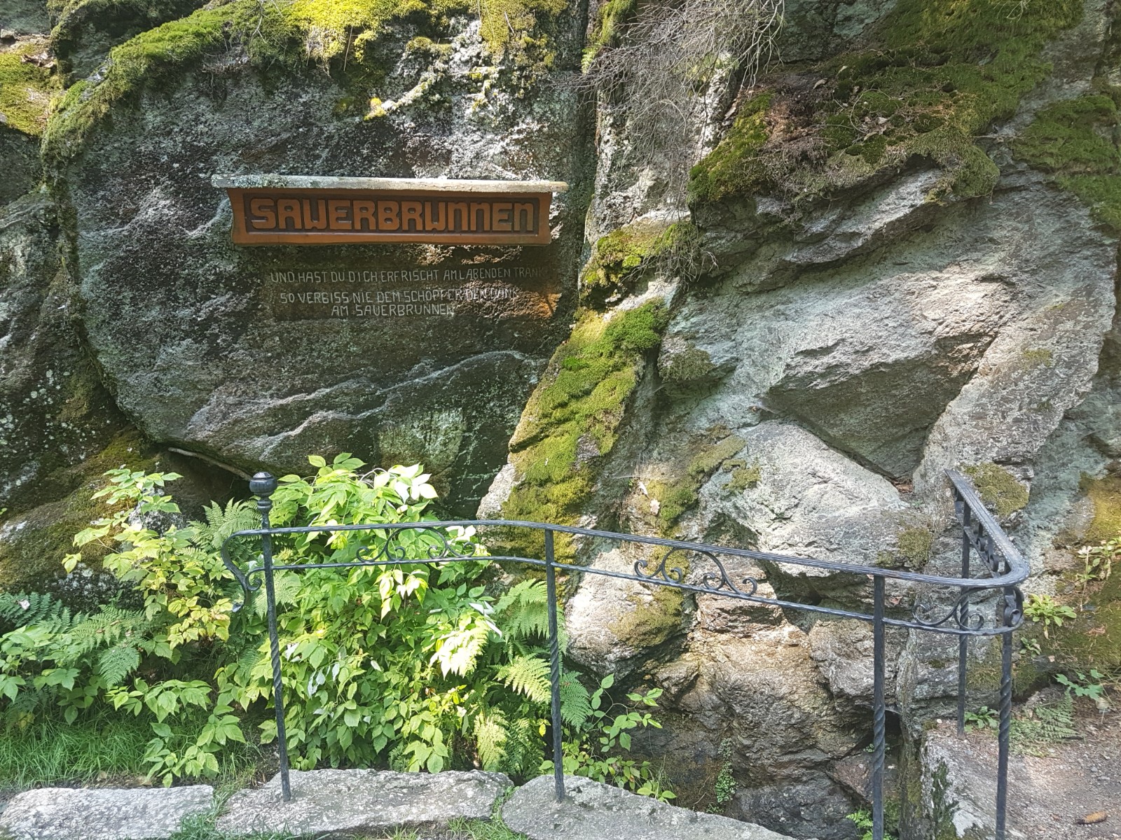 Am Sauerbrunnem fülle ich meine Wasservorräte auf, pur schmeckt das Wasser allerdings sehr nach Eisen – dafür spricht auch der Roststreifen direkt neben dem Rinnsal.