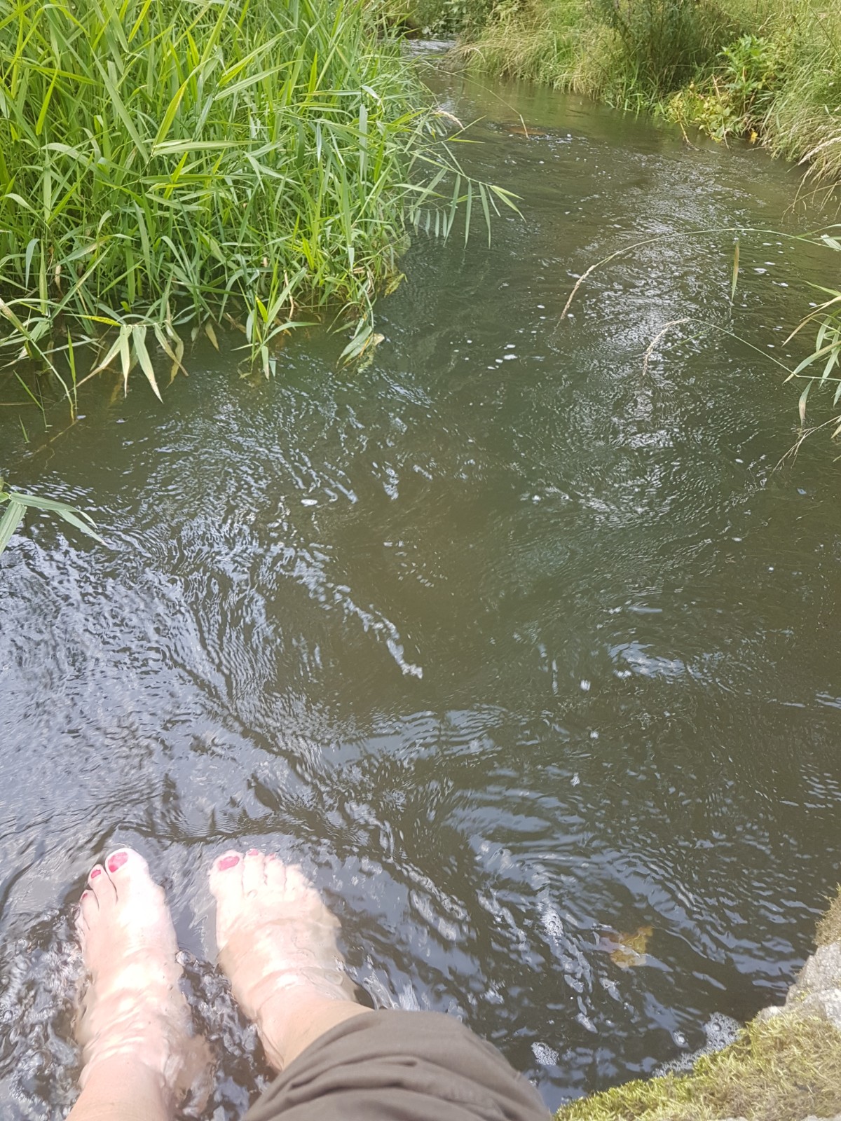 An diversen Stellen versuche ich einen einfachen Zugang zum Ufer zu finden, der einen schönen Platz zum Sitzen und Füßebaden bietet. Die großen Steine im Schatten sind noch feucht vom Regen der letzten Nacht, und das Moos darauf macht sie extrem rutschig. Aber hier kommt dann endlich die richtige Stelle.