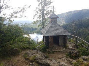 Als ich in der Kapelle ankomme, tröpfelt es bereits, und rundherum hat sich der Himmel bezogen – zum Teil auch ziemlich dunkelgrau. Ich warte den Regen ab, und dann geht es allmählich in die Höhenlagen, die schon keinen geschlossenen Wald mehr haben.