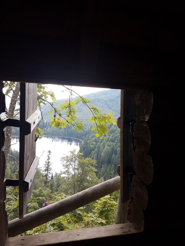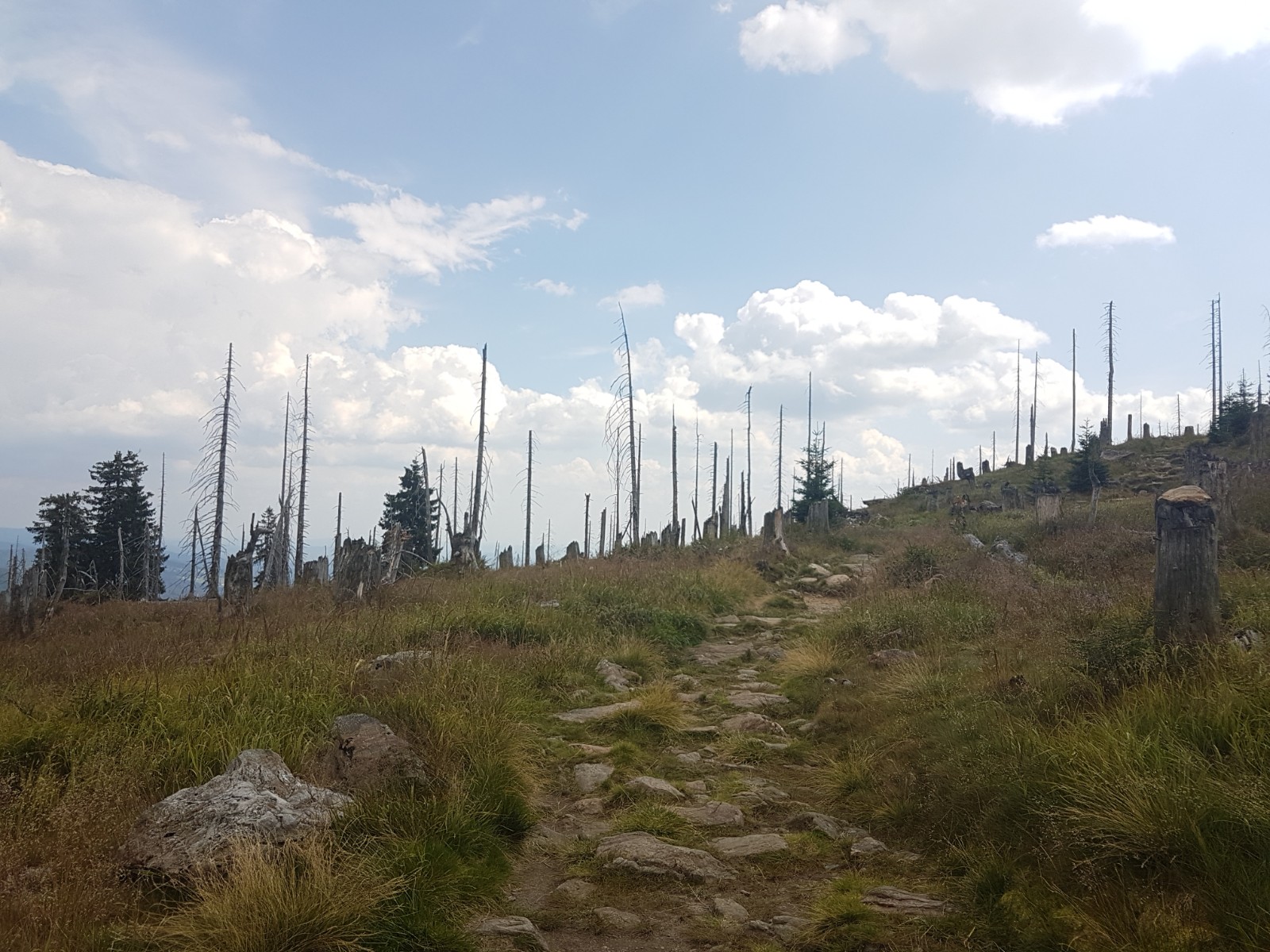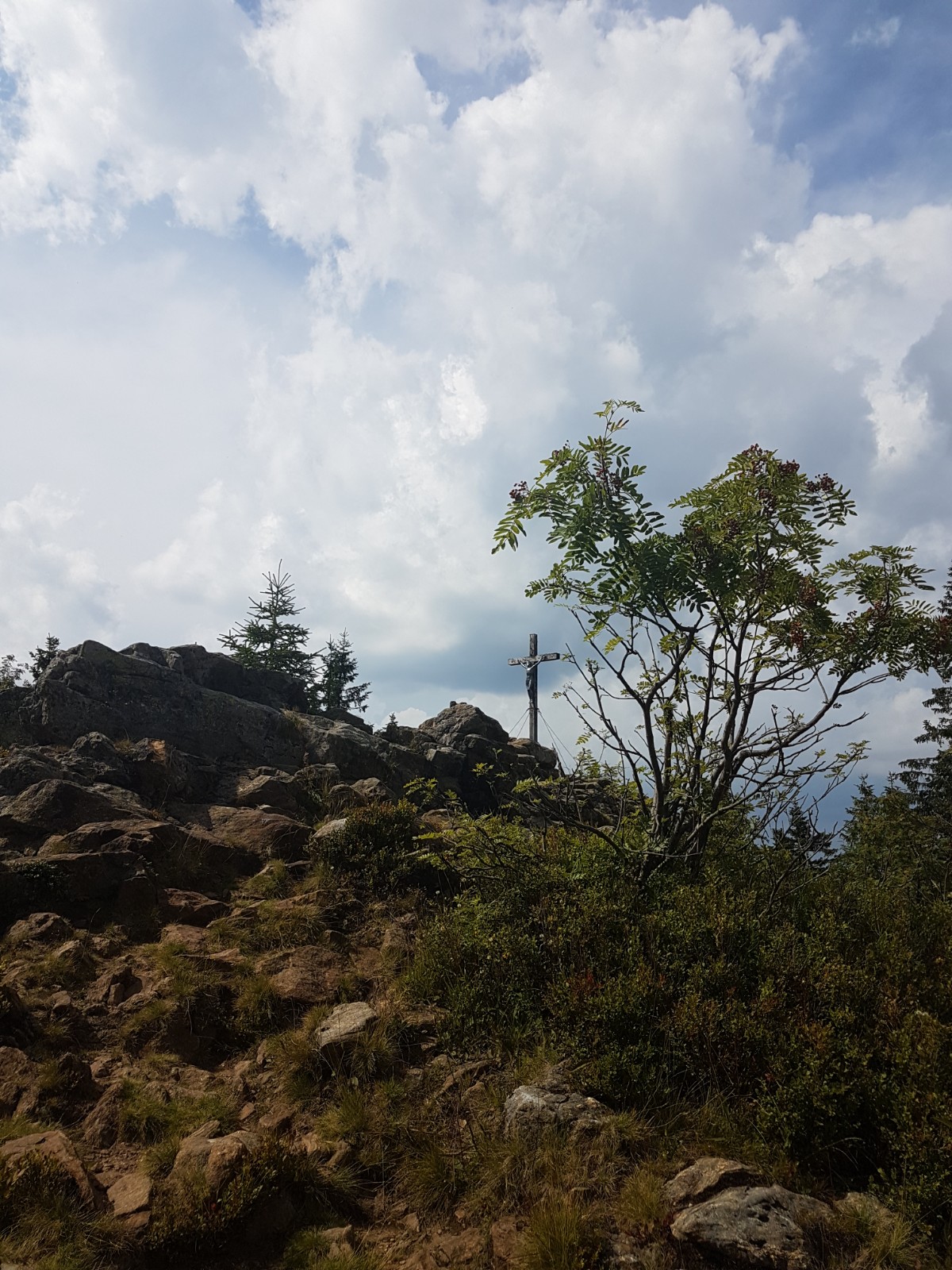Umso mehr freue ich mich, dass das Waldschmidthaus wieder geöffnet ist; zwar nicht als Unterkunft, aber zum Einkehren. Ein junges Paar bewirtschaftet diese Hütte jetzt. Auch einen netten Hüttenhund gibt es. Ich frage die beiden jungen Wirte, ob sie meinen, dass es auch auf dem Rachel noch gewittern wird wie am Großen Arber, wo ich es wirklich sehen konnte. Der junge Mann gibt die Frage an den Hund weiter, der zu zittern anfängt, wenn sich ein Gewitter nähert- aber der Hund bleibt ruhig und behält Recht: Es bleibt trocken, und das relativ nahe Gewitter zieht ab.
