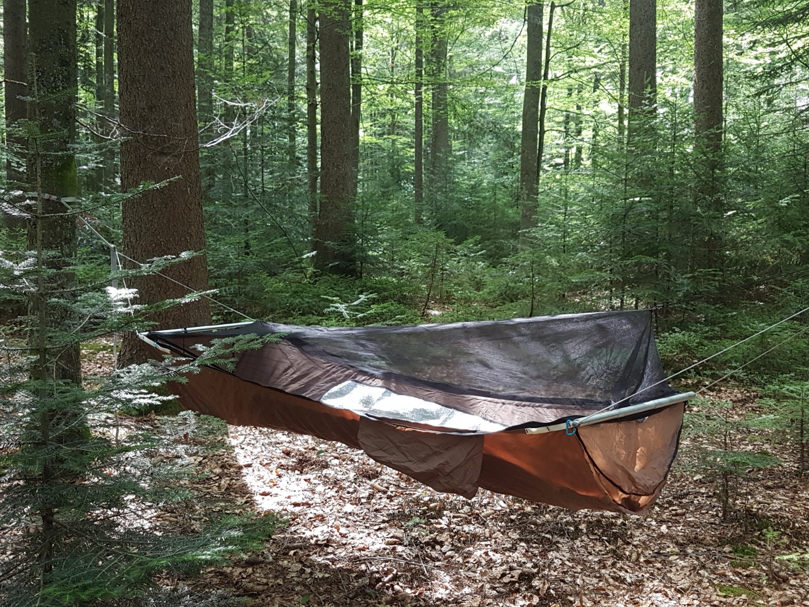 Aber erst einmal steige ich aus dem Bähnchen aus, und suche mir meinen Weg, der sich als herrlicher schmaler Pfad durch abwechslungsreichen Wald zeigt. Dann komme ich auf eine Forstpiste, und ich habe vor, bald wieder davon zur Schneiderwiese abzugehen, um dort am Waldrand nach einen schönen Hängeplatz am Waldrand zu suchen. Das lohnt sich allerdings nicht (zu viel Gestrüpp), und ich gehe weiter bis zu einer der Alternativrouten des Goldsteigs, ebenfalls wieder eine Forstpiste. Nach rund 2 km gehe ich wieder ab Richtung Süden, und dieses Mal habe ich Glück: Mein Abstecher ist ein schmaler, aber gut erkennbarer Pfad, der weder auf der Garmin- noch auf der Karte von Viewranger verzeichnet ist und nach ca. 700m direkt auf den Pandurensteig zu steuert. Dieser führt später zum Ortseingang von Spiegelau und unmittelbar am Hotel vorbei. Aber vorher entecke ich noch einen schönen Pausenplatz und nutze ihn mit der Hängematte – wie sich herausstellen wird, das letzte Mal während meines Sabbaticals.