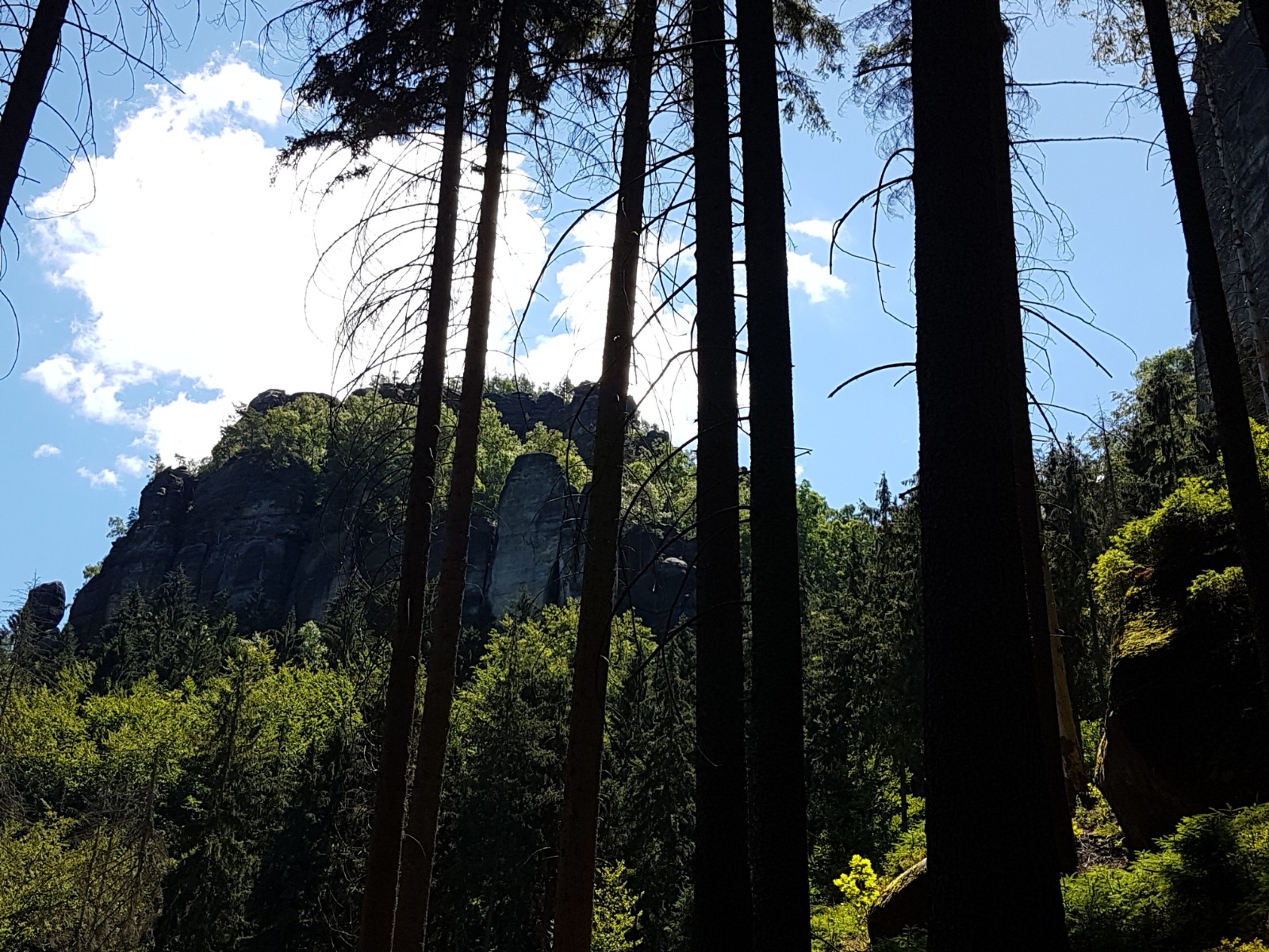 Am Sa.,30.06.18 will ich mich endlich den Felsformationen nähern, für die diese Region so berühmt ist; die Wege dort sind nicht alle einfach, und verlangen Trittsicherheit – und mir ist bewusst, dass dies nicht gerade meine größte Stärke ist. Dennoch suche ich aus dem ADAC-Wanderführer eine Tour rund um die Affensteine und den Carolafelsen heraus. Startpunkt ist wieder der Beuthenfall, aber dieses Mal geht es von dort nach Süden, nicht nach Norden. In der (dürftigen) Wegbeschreibung ist die Rede von einem steilen Abstieg in das „Sandloch“, der unbedingt gute Trittsicherheit verlangt. Aber nach den Karten kann man mit einem Umweg diesen Abstieg vermeiden.