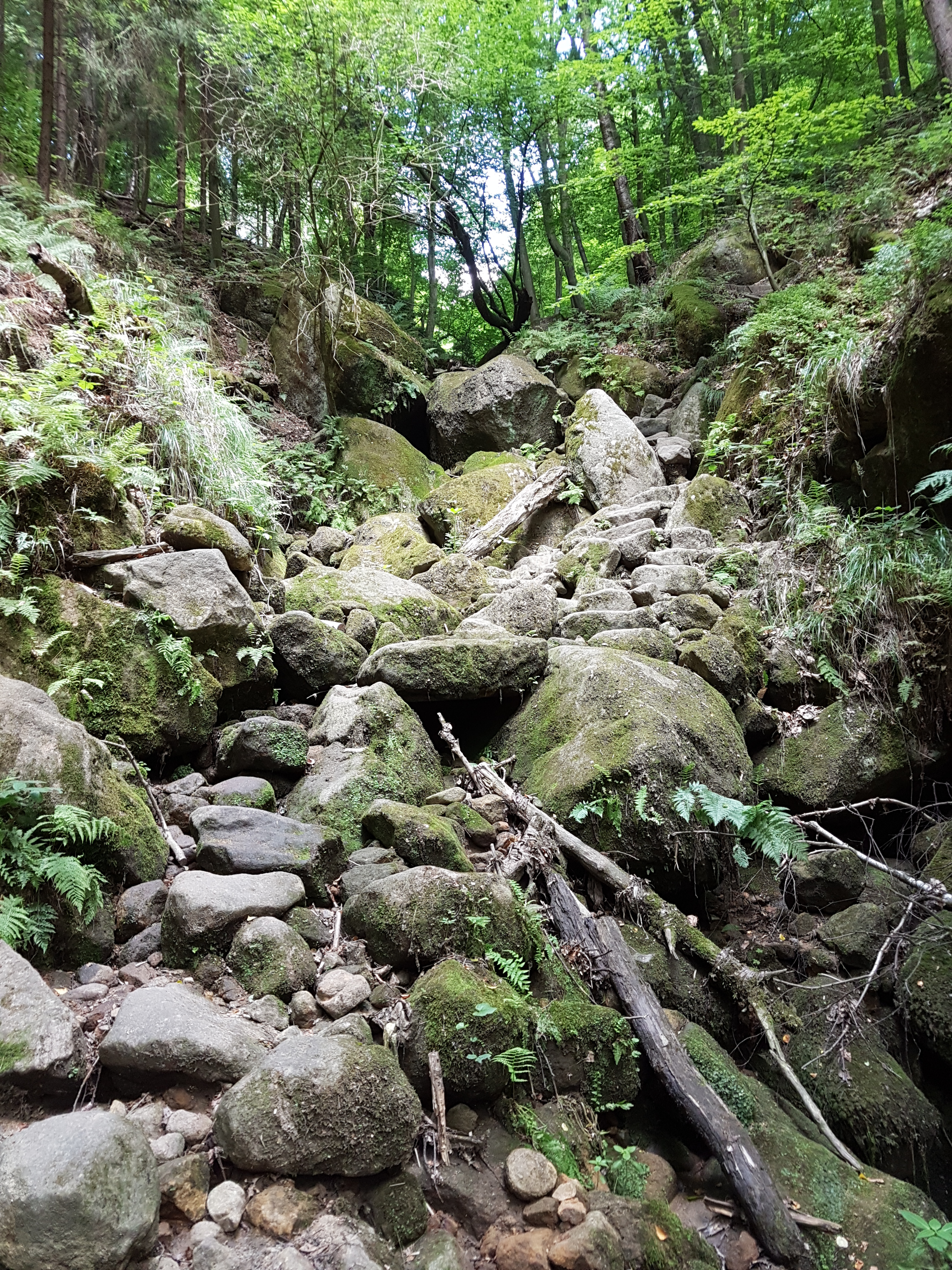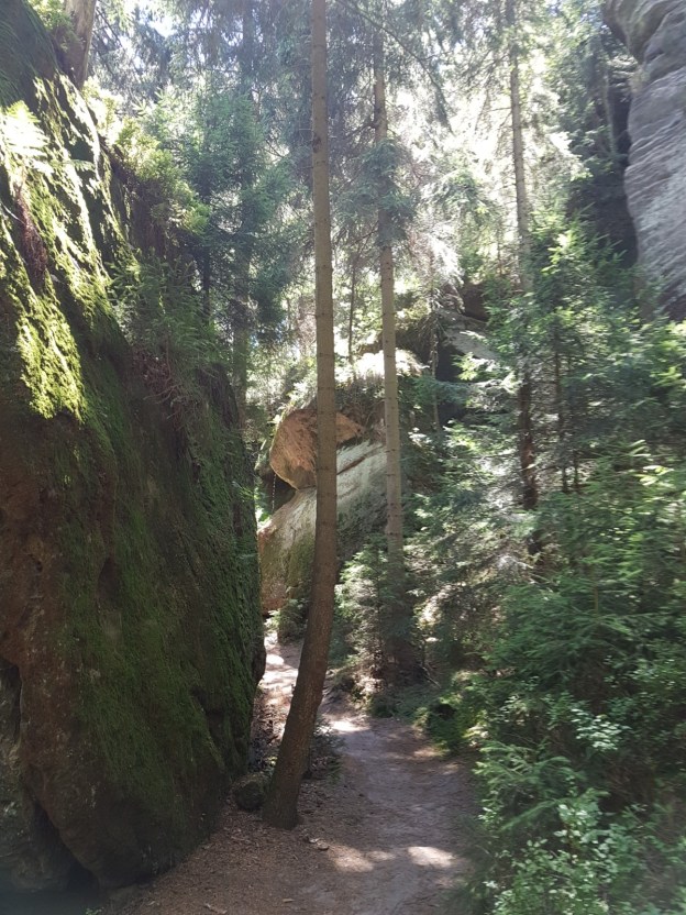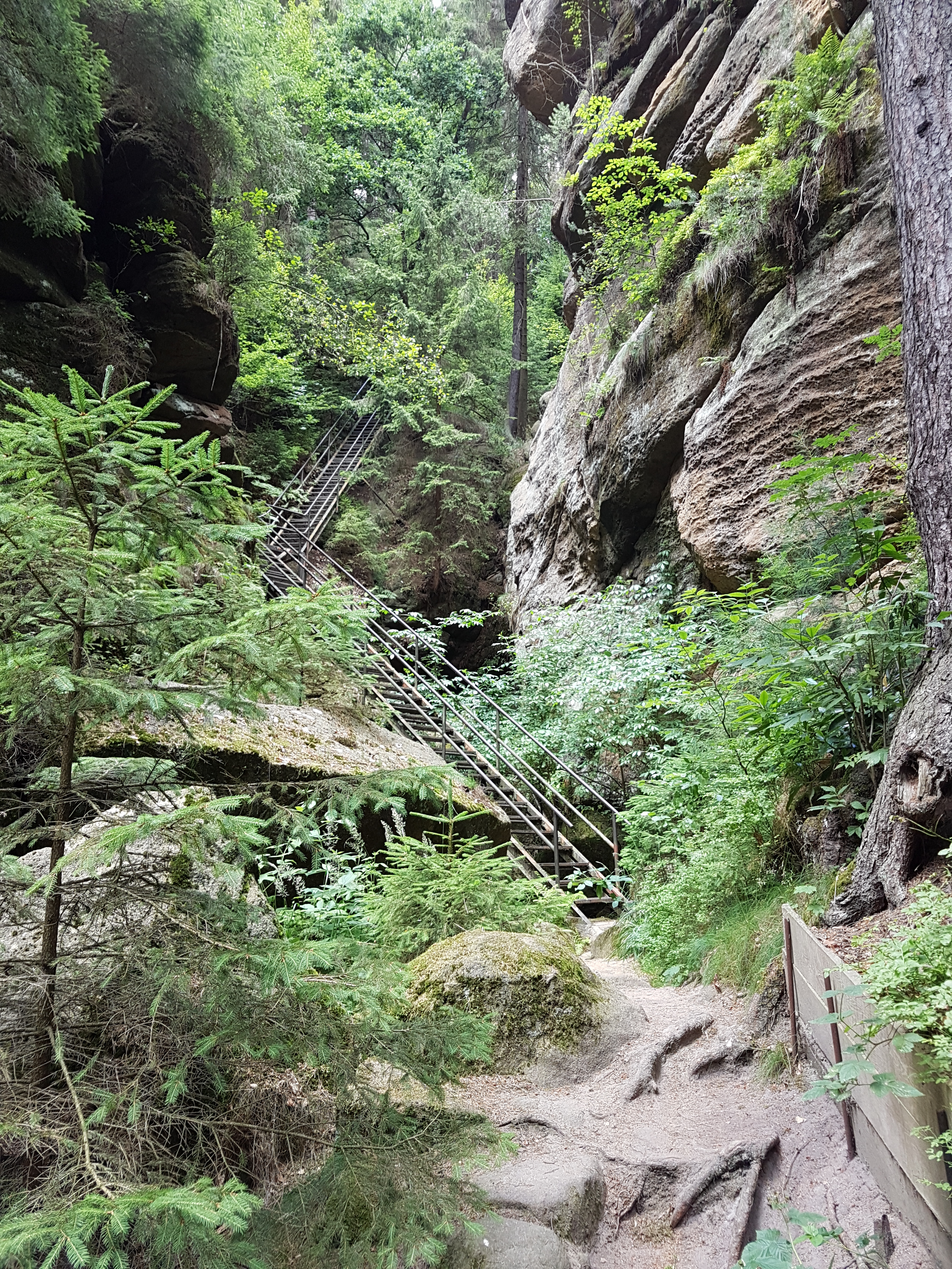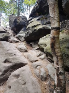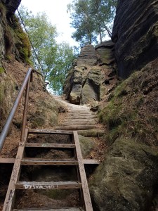 Am Sonntag, 01.07.18 suche ich mir daher eine selbst zusammengestellte Tour ohne Track, die etwas abseits der Hotspots und Massenwanderungens sein sollte. Tatsächlich sollte dies als Abschluss der Woche in der sächsischen Schweiz eine besonders hübsche Wanderung werden. Ich fahre bis Waldhäusl, eine Station der Straßenbahn noch vor dem Beuthenfall. Dort geht es gleich erst einmal so weiter, wie ich es vom Vortag kenne: Auf Felsen und über Leitern durch die Dorfbachklamm.