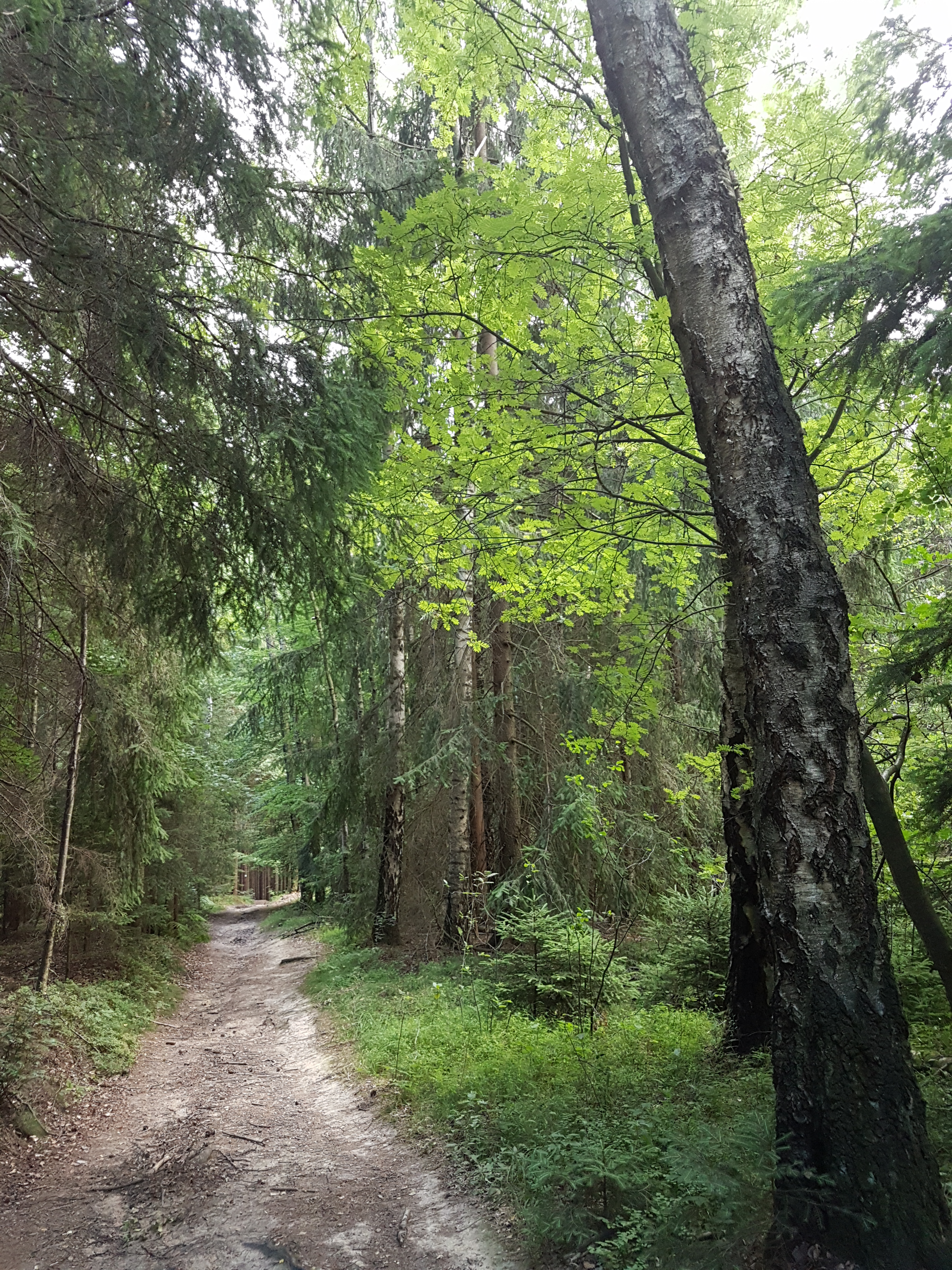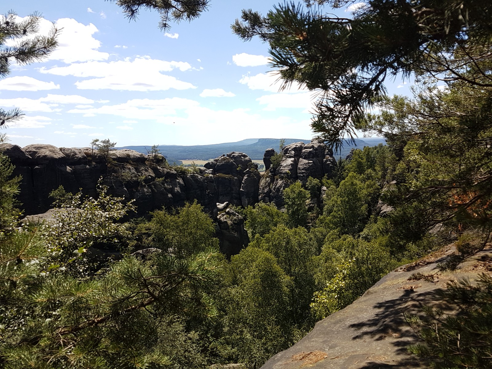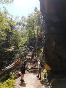 Irgendwann habe ich die Felsen passiert, und danach geht es auf einfacheren Wegen weiter. An einer Weggabelung beschließe ich, nicht die Runde zu vollenden, weil sie dann nur noch dem Malerweg folgt. Ich gehe stattdessen auf anderem Weg bergab in das Kirnitzschtal, zu einer anderen Station der Straßenbahn. Ich verspreche mir davon etwas weniger Trubel. Aber selbst hier habe ich praktisch fast permanent andere Wanderer in Hör- oder Sichtweite – wer will es ihnen verdenken, die Gegend bietet einmalig schöne Wege und Ausblicke, die Wetterbedingungen sind ideal, es ist Wochenende und Ferienanfang. Man muss nur wissen, dass man speziell hier in diesem Eckchen lieber wochentags wandern sollte, wenn man Ruhe sucht.