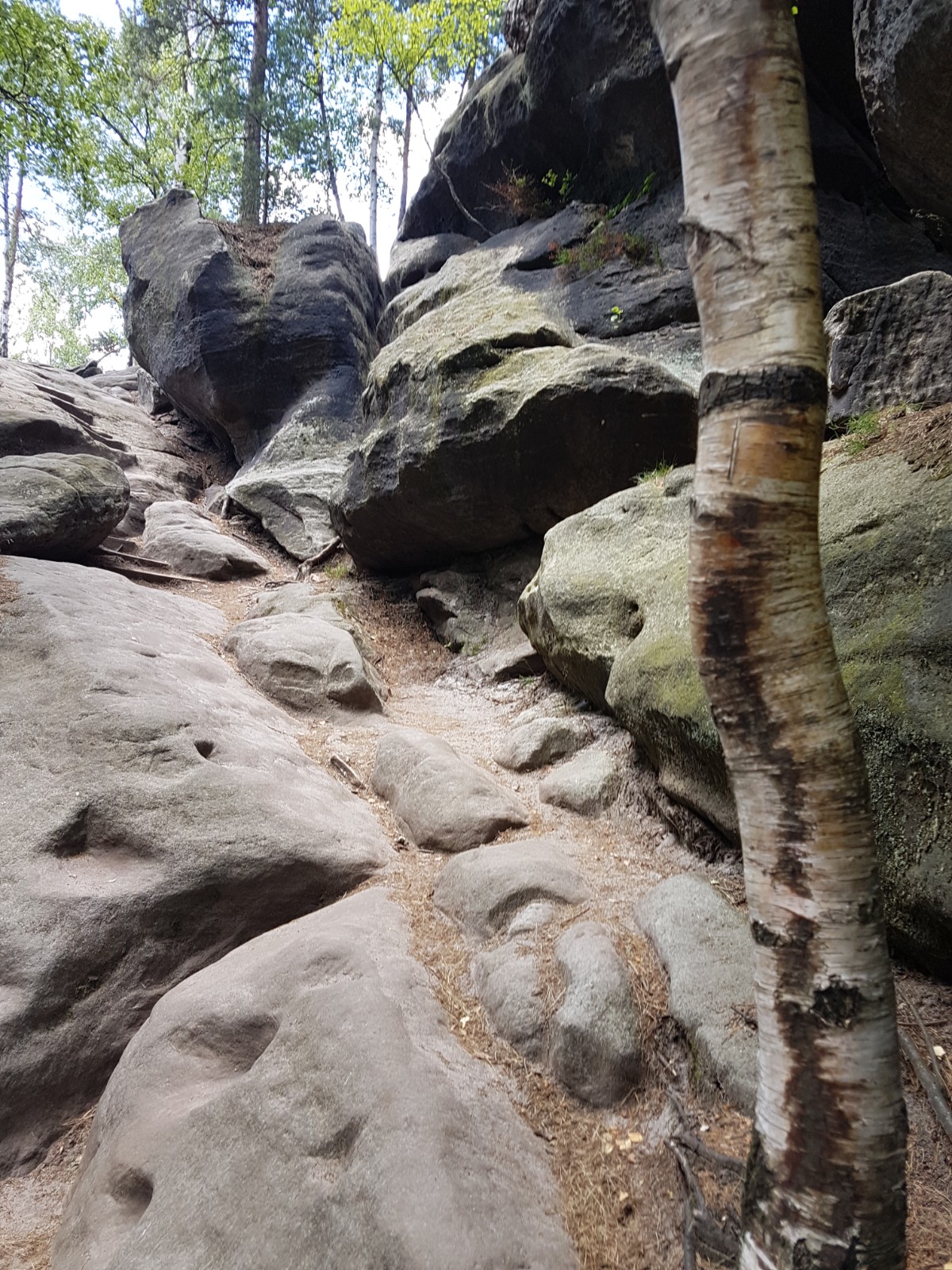 es laufen einige Wege zusammen, und so wird es auch wieder deutlich voller. Bald kommt der Abstecherweg zum Carolafelsen; bei der letzten Passage muss ich mich etwas überwinden, aber dann gehe ich doch hoch, und es klappt ganz gut.