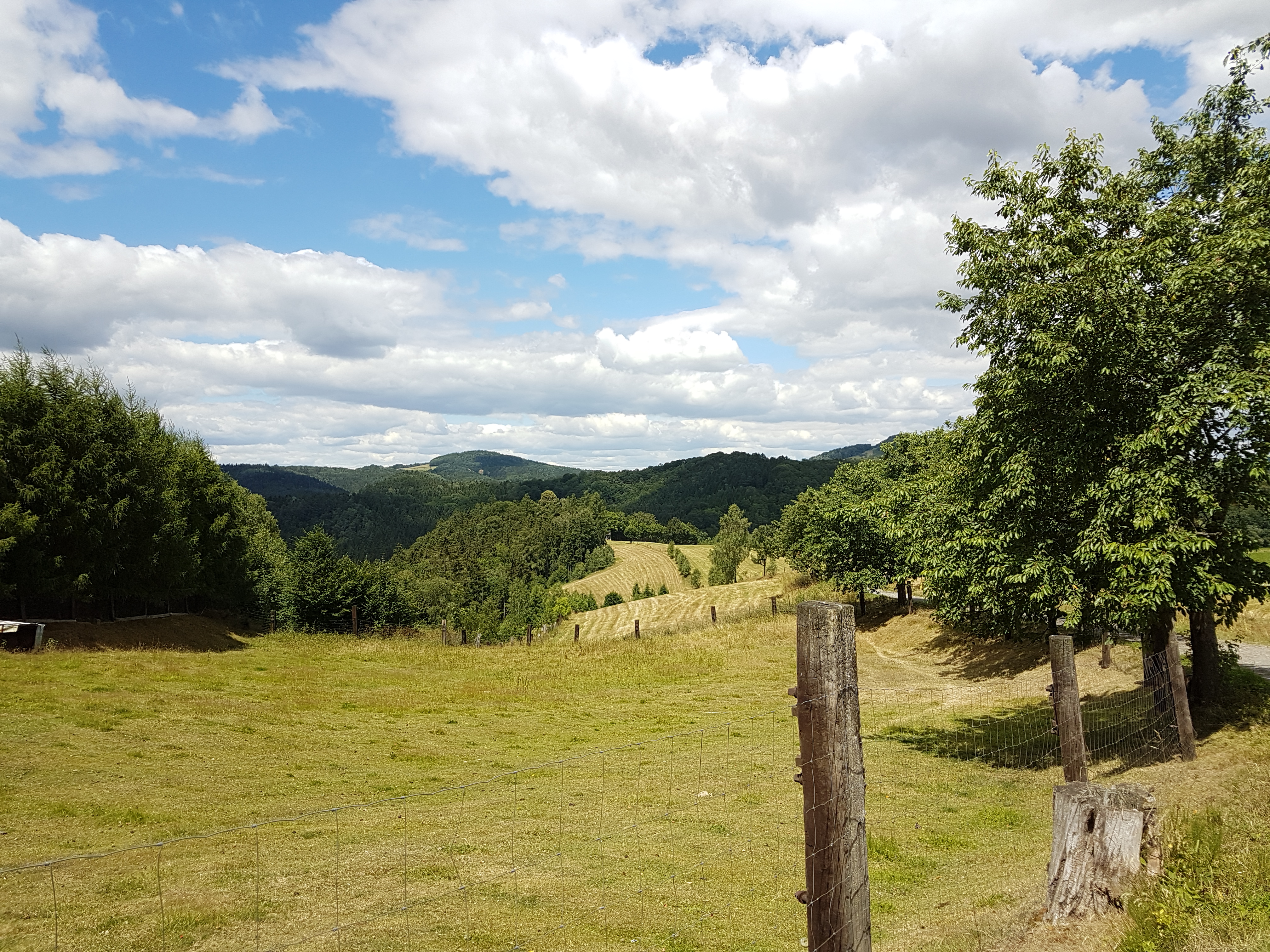Oben angekommen – ich habe eine Weile gebraucht – geht es einfacher weiter, und bald erreiche ich Altendorf. Der Ort ist schnell passiert, dann geht es wieder allmählich bergab. Ich komme aus dem tief eingeschnittenen Kirnitzschtal, und mein Weg wird mich in das Tal der Sebnitz führen, dazwischen befindet sich ein Höhenzug. Hübsch ist es hinter dem Ort, sanfte Hügelwellen mit Wiesen und Feldern, abwechselnd mit Wald. Das Wetter ist nicht super und der Himmel recht wolkig, aber zum Wandern ist alles ok.