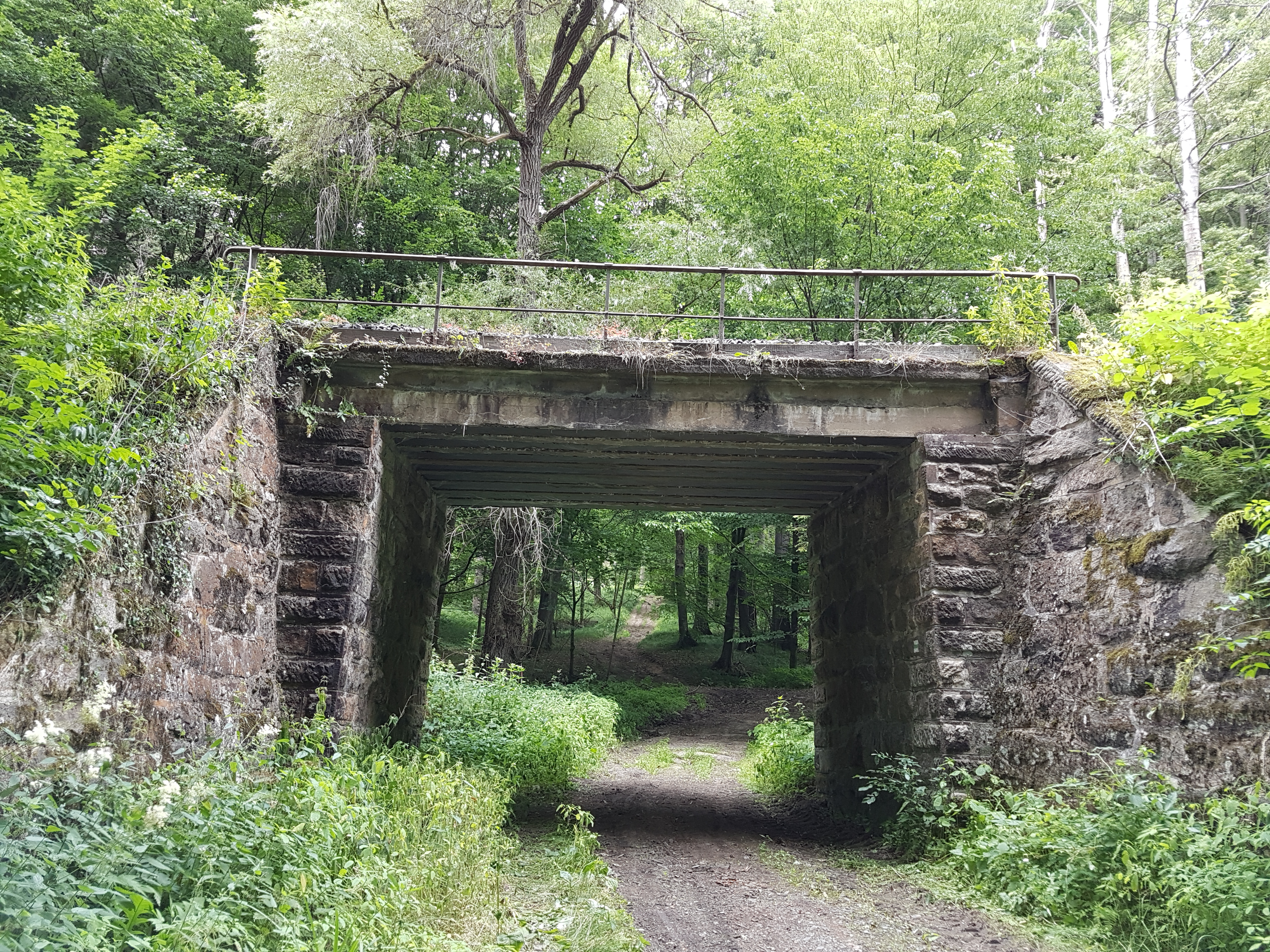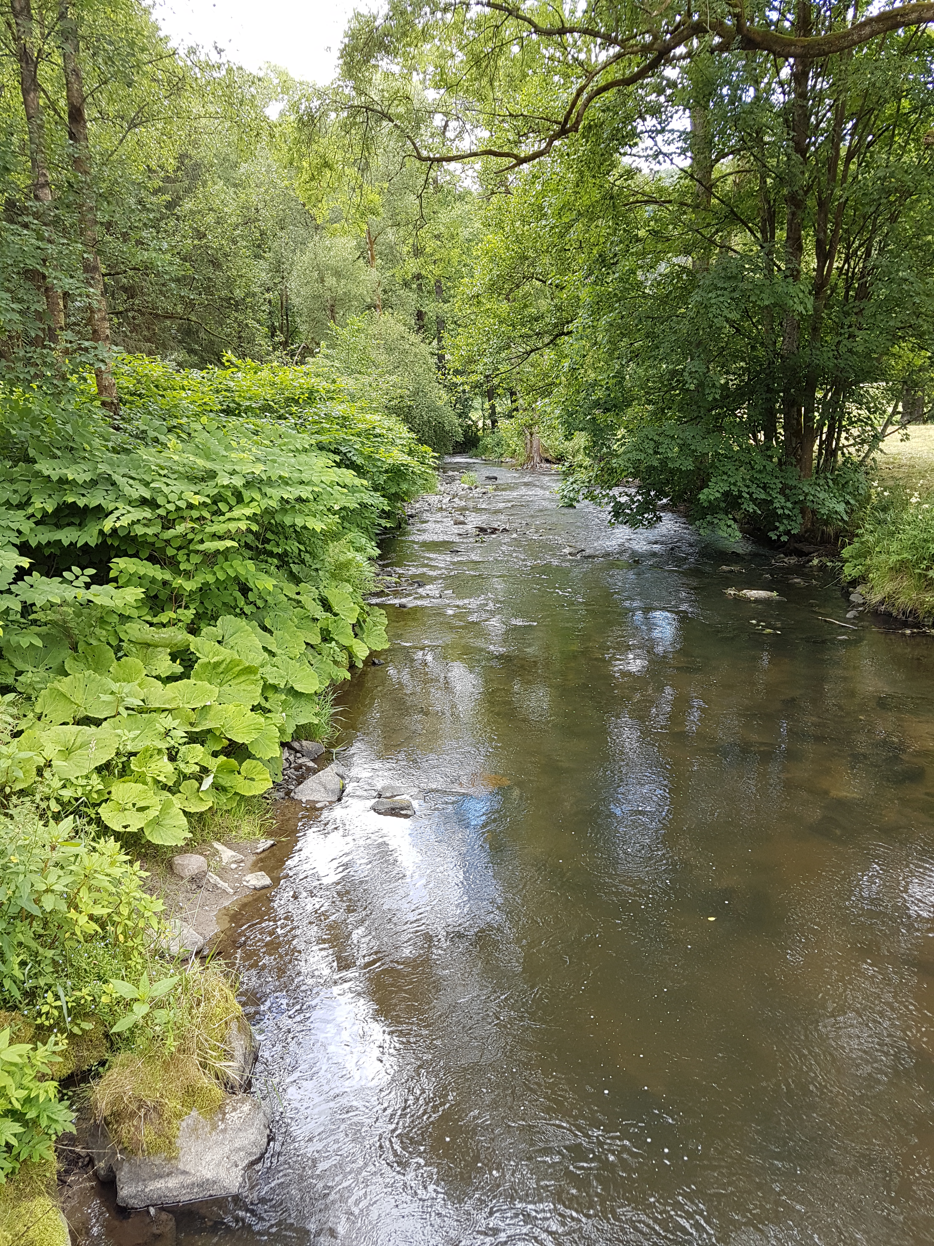 Der Pfad ist schmal und recht zugewachsen, es ist urig und hübsch mit der plätschernden Sebnitz, an deren anderem Ufer eine ausgedehnte Lichtung ist. Dann führt mich der Weg weg vom Bach, hinein in Laubwald, und hier geht es ganz schön bergauf. Ich bin jenseits der Grenze des Nationalparks sächsische Schweiz und suche mir am frühen Nachmittag ein Plätzchen für eine Hängemattensiesta, die ich ausgiebig nutze. Der Wind hat inzwischen aufgefrischt, und der Himmel ist fast bedeckt, es bleibt aber trocken, als ich recht spät wieder aufbreche. Der Waldrand ist bald erreicht, und ich komme nach Mittelndorf, wie Altendorf ein kleiner überschaubarer Ort, hier mit einem privaten kleinen Campingplatz, der zugleich Hüttenlager und Apartments anbietet. Für die beträchtliche Anzahl Gäste kommt mir das alles etwas eng vor, es wäre wohl nix für mich. Nach Mittelndorf geht es dann nur noch bergab, wieder in das Kirnitzschtal, wo ich die Straßenbahnhaltestelle Beuthenfall ansteuern will. Der Weg ist einfach, ich komme zügig durch die Wiesen und den Wald voran.