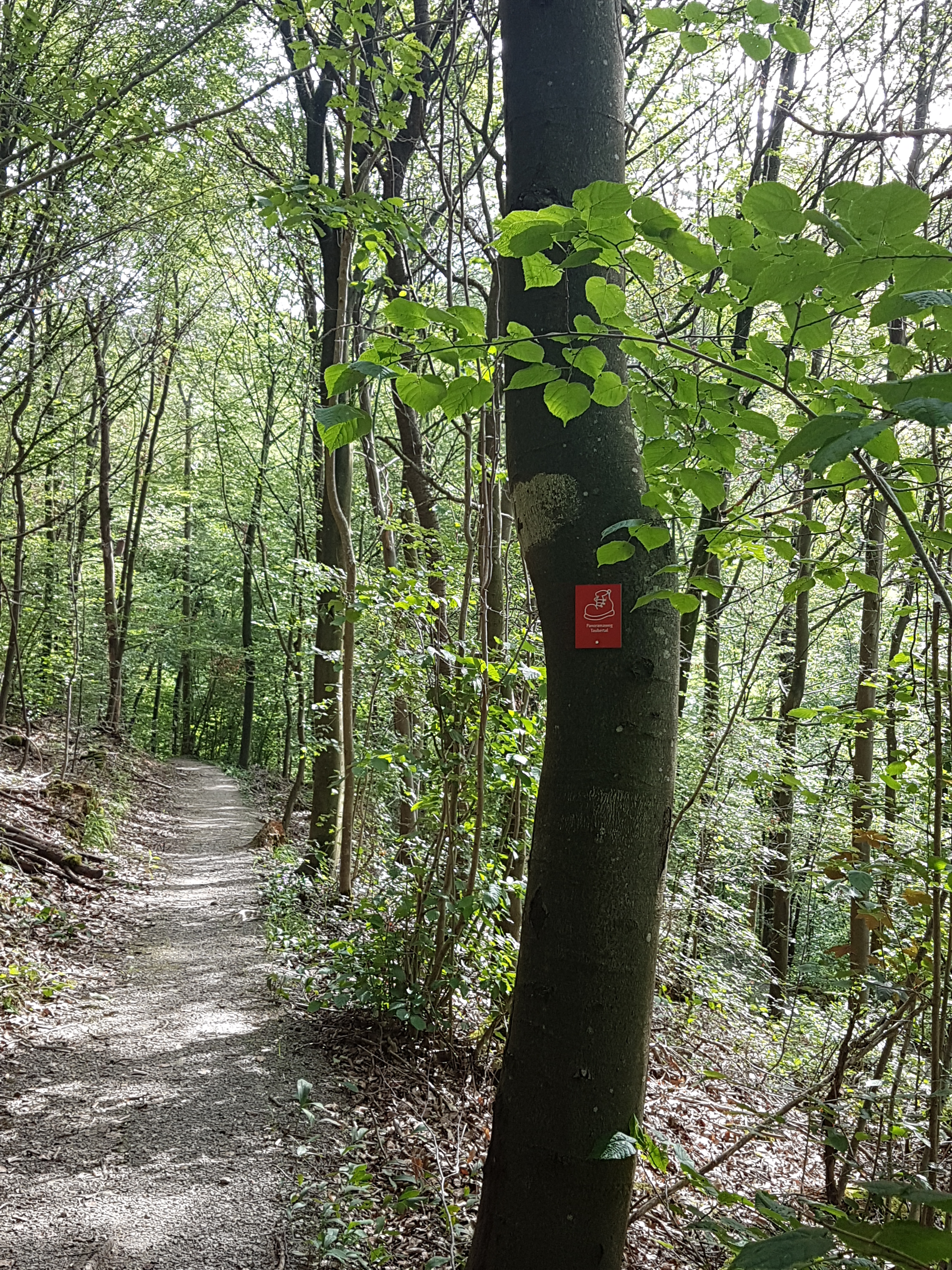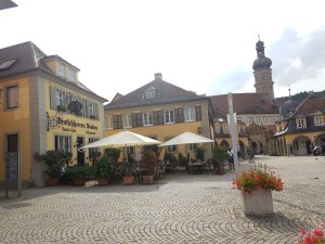 Am Freitag, 19.07.19 geht es weiter in’s Taubertal. Es ist kühler geworden, und weitgehend bedeckt. Die Öffis brauchen eine Weile für die etwa 150-160km, und bis ich in Laudenbach eintreffe, ist es schon etwa 14:30. Von dort will ich – auf meinen eigenen Spuren von 2013 während meiner Deutschlandtour, siehe hier – die recht überschaubare Strecke bis Weikersheim wandern.Am Anfang besuche ich die mitten im Wald gelegene Bergkirche, ein Ort mit besonderer Atmosphäre, wie ich finde. Der Weg dahin vom kleinen Bahnhof aus führt über viele Stufen hoch und macht mir unmissverständlich klar, dass ich nun wieder das gesamte Gewicht des Rucksacks auf dem Rücken habe. Der Wald um die Kirche herum ist hübsch, und nach einer Besichtigung des Inneren der Kirche setze ich mich direkt ins Gras am Wegrand und mache Pause. Bei solchen Gelegenheiten bin ich immer wieder dankbar für die dünne Alumatte, die ich bei jeder Wanderung dabei habe und die über etliche Jahre schon viel mitgemacht hat und diverse mehr oder weniger schön geflickte und offene Löcher aufweist. Eigentlich ist das Ding ein Frostschutz für die Autowindschutzscheibe. Ich sitze offenbar sehr still, denn plötzlich landet auf dem Baumstumpf etwa 2 m neben mir ein Schwarzspecht, den ich voller Entzücken bewundere. Groß ist er, sogar noch deutlich größer als ein Grünspecht. Leider bleibt er (oder sie?) nur ein paar Momente, aber ich freue mich noch lange über diese seltene Begegnung. Ich breche wieder auf, und rund einen halben km weiter erreiche ich den Waldrand; nun geht es auf einer kleinen Straße weiter, bis in das Städtchen hinein. Inzwischen ist es wärmer und sonniger geworden, und als ich auf dem Marktplatz ankomme, kehre ich erst einmal in der netten Außengastronomie meines Hotels ein.
