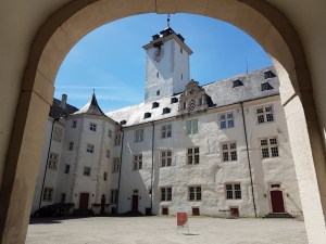sehe ich mir die Ausstellung zum Deutschen Orden an, der ursprünglich zur Versorgung Kranker und Verletzter im Heiligen Land gegründet wurde, und später zum einflussreichen Ritterorden wurde, der auch eigene Baumeister beschäftigte: Einer davon schuf eine besondere Wendeltreppe im Schloss – freitragend mit offener Spindel, verziert mit unzähligen Pflanzenornamenten, Tier- und Engelsgestalten  mit der Besonderheit, dass genau über dem Zentrum der Treppe die gemalte Sonne steht, siehe Beitragsbild.