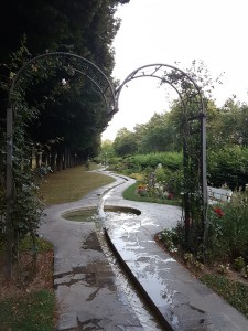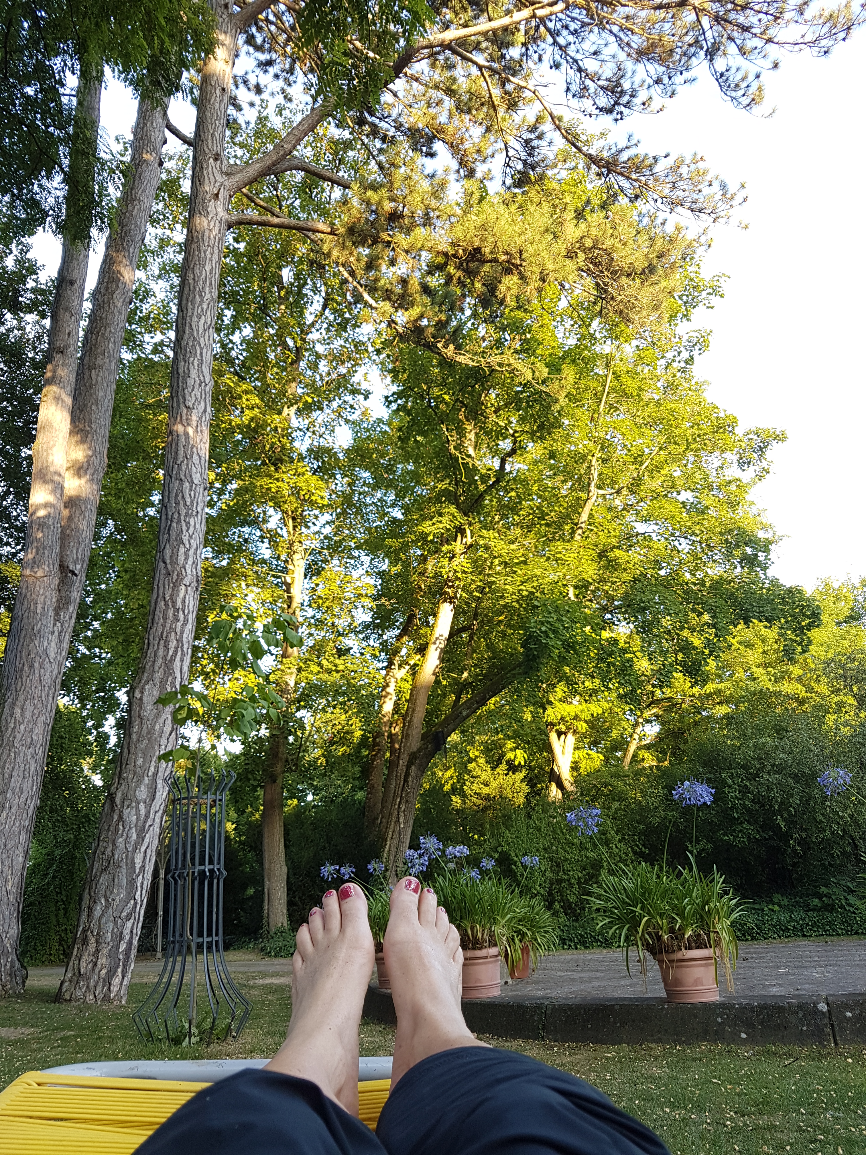 Es fängt schon sachte an zu dämmern, als das Konzert vorbei ist, immer noch ist es herrlich warm, und ich habe nur den relativ kurzen, hübschen Weg durch den Kurpark vor mir. Ein kleines Mädchen mit seiner Mutter kommt mir entgegen, sie ist barfuß und planscht  in dem kleinen (künstlichen?) Bachlauf . Ich muss es ihr einfach nachtun, ziehe die gestern hier im Ort gekauften Sandalen aus und gehe durch das angenehm kühle Wasser bis zum Ende des Parks.