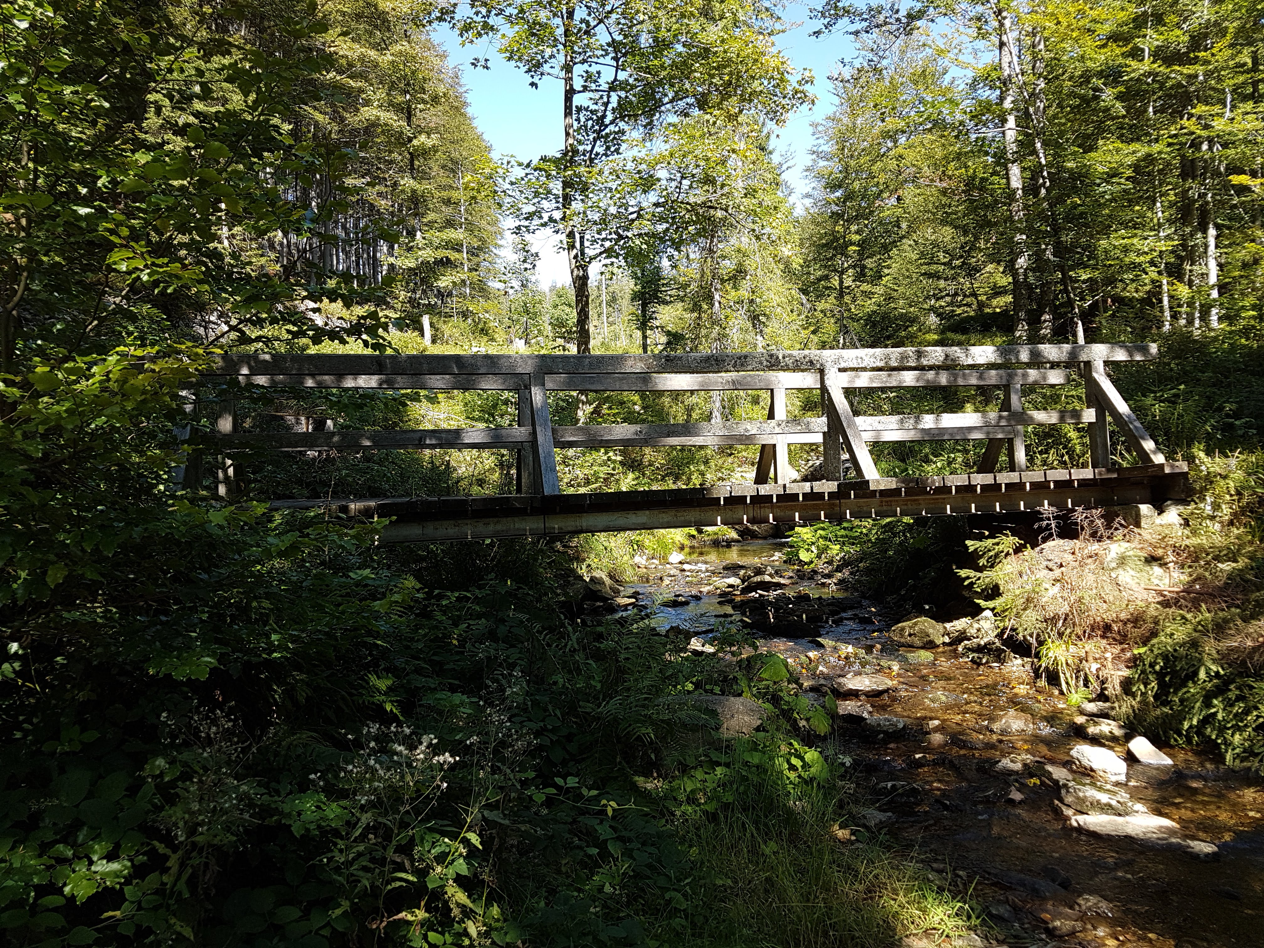 Nach der Hütte geht es weiter durch Wald, über einen weitere freie Hochfläche (auf der die eingezeichnete Quelle allerdings zugebaut ist), bald einen Hang hinunter, und wir sind froh, als wir auf den Rindelbach stoßen, den wir zum Waschen (Frauen und Geschirr) und Auftanken nutzen.