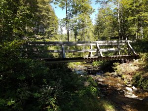 Wir gehen am Rand des Ortes entlang, kehren aber nicht ein, sondern tanken am Großen Steinbach auf – und müssen feststellen, dass entweder das Wasser von sich aus oder durch den Filter einen ziemlich scheußlichen Geschmack hat. Egal – unsere Tour geht zur Neige, und wir müssen nicht mehr kochen. Nach dem Ort biegen wir auf einen Weg Richtung Ludwigsthal ab und passieren das Wildniscamp Falkenstein, eine ganz interessante Einrichtung für Schulklassen, und große Gruppen mit verschiedenen Hüttentypen auf einem weitläufigen Gelände. Wir überlegen, ob dies ein möglicher Veranstaltungsort für das Hängemattentreffen sein könnte, kommen aber zu der Überzeugung, dass es dafür nicht ideal wäre: Der Weg führt mitten hindurch und jeder Passant würde viele Fragen stellen, und die Infrastruktur mit den Hütten und der Küche im Zentralgebäude würden die Hängemattisten wenig bis gar nicht nutzen. Wir gehen weiter, und haben nun breite, bequeme Forstwege vor uns. Das Himmel hat sich bezogen, und als wir schließlich am Luchsgehege im Tierfreigelände Ludwigsthal ankommen, beginnt es zu regnen. Wir kehren im Haus zur Wildnis ein und essen jede eine ordentliche Portion, bevor wir zum kleinen Bahnhof gehen, wo wir in die Waldbahn einsteigen, die uns über Zwiesel und Bettmansäge nach Regen bringt, wo uns Kai abholt.