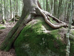 Viele der Heidelbeerbüsche sind für einen Fuchspo zu hoch, sodass wir das Risiko für Fuchsbandwürmer nach hinten sortieren können. Mit lila Fingern und Lippen geht es weiter, bald von den sonnigen Hochflächen in schönen Mischwald. Am Rand der Freifläche machen wir an einer Hütte Pause, die den Hirtenunterkünften früherer Zeiten nachempfunden ist.