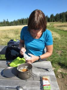 Dort bereiten wir unser Abendessen zu; ich habe dieses Mal selbst gemachte Trekkingmahlzeiten vorbereitet, deren Rezepte ich hier entdeckt und nachgebaut habe; heute soll es Tomatennudeln mit Pinienkernen geben. Tatsächlich ist dieses Fresschen ziemlich lecker.