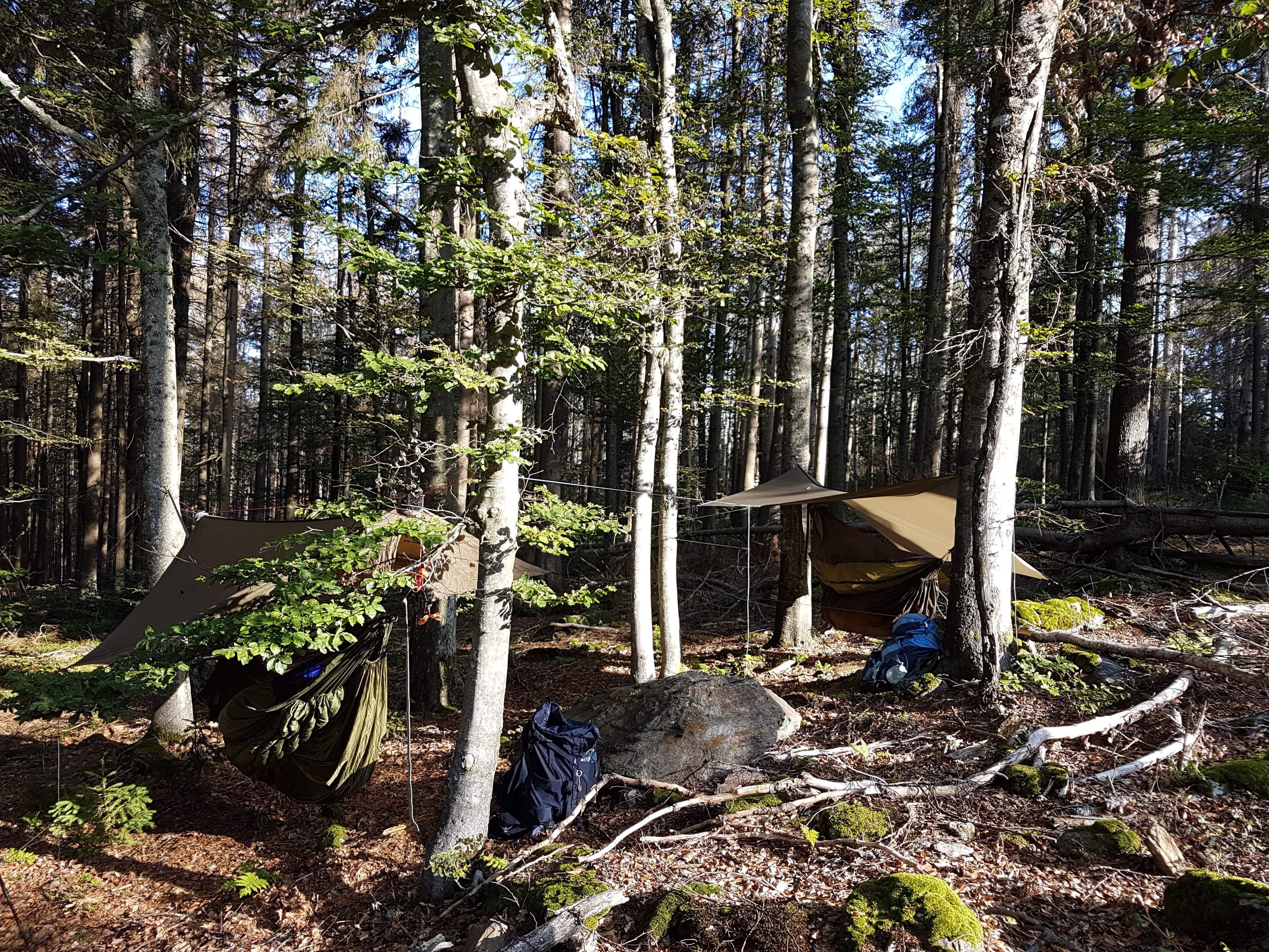 Dann wird es Zeit, aufzubrechen, wenn wir noch in Ruhe den nächsten Übernachtungsplatz suchen und aufbauen wollen. Dieses Mal dauert es tatsächlich etwas länger, denn wir kommen durch Gelände mit viel Totholz und Gestrüpp. Endlich finden wir eine Stelle, die zwar nicht ganz so schön ist wie die letzte, aber sehr akzeptabel.